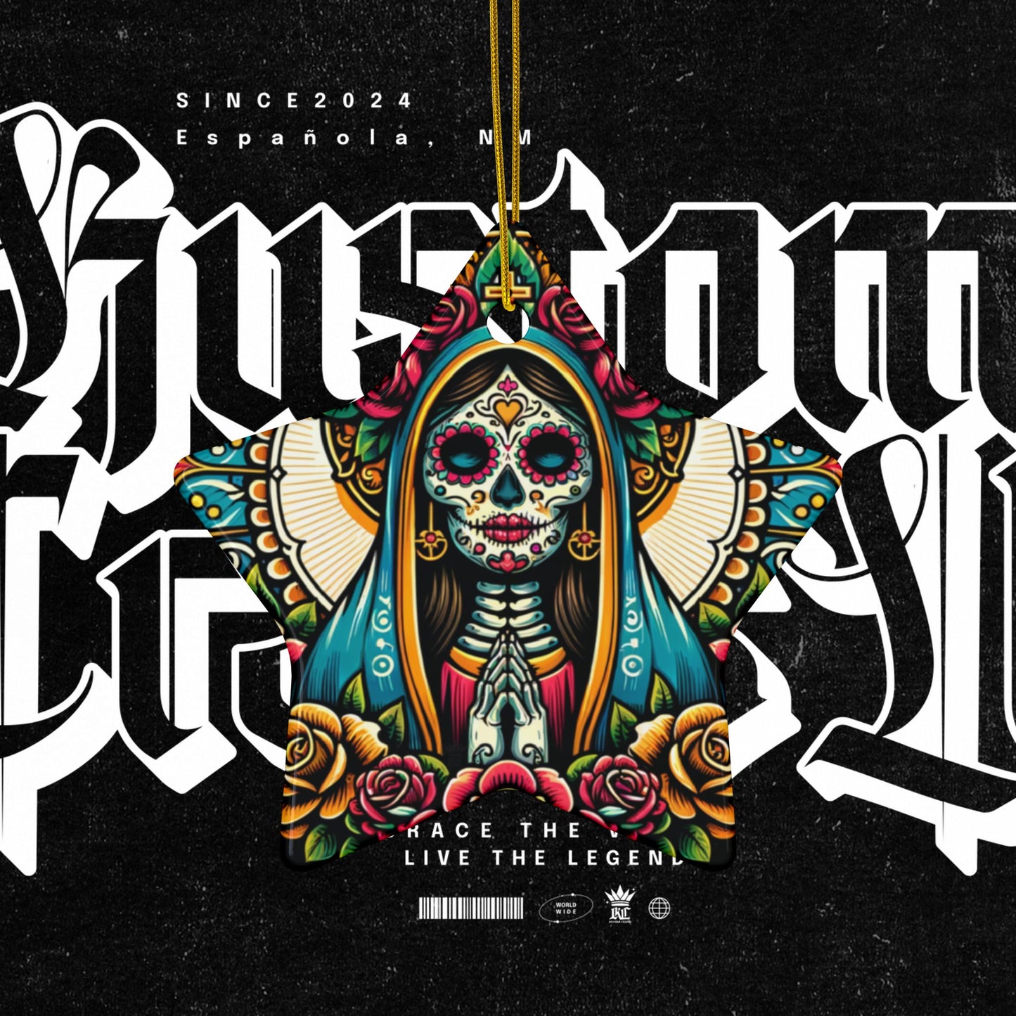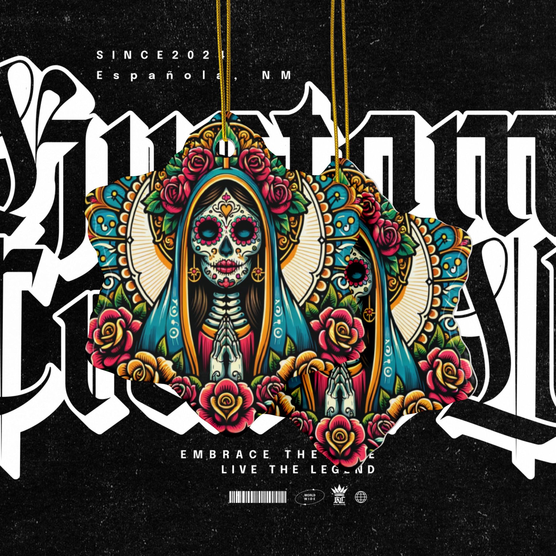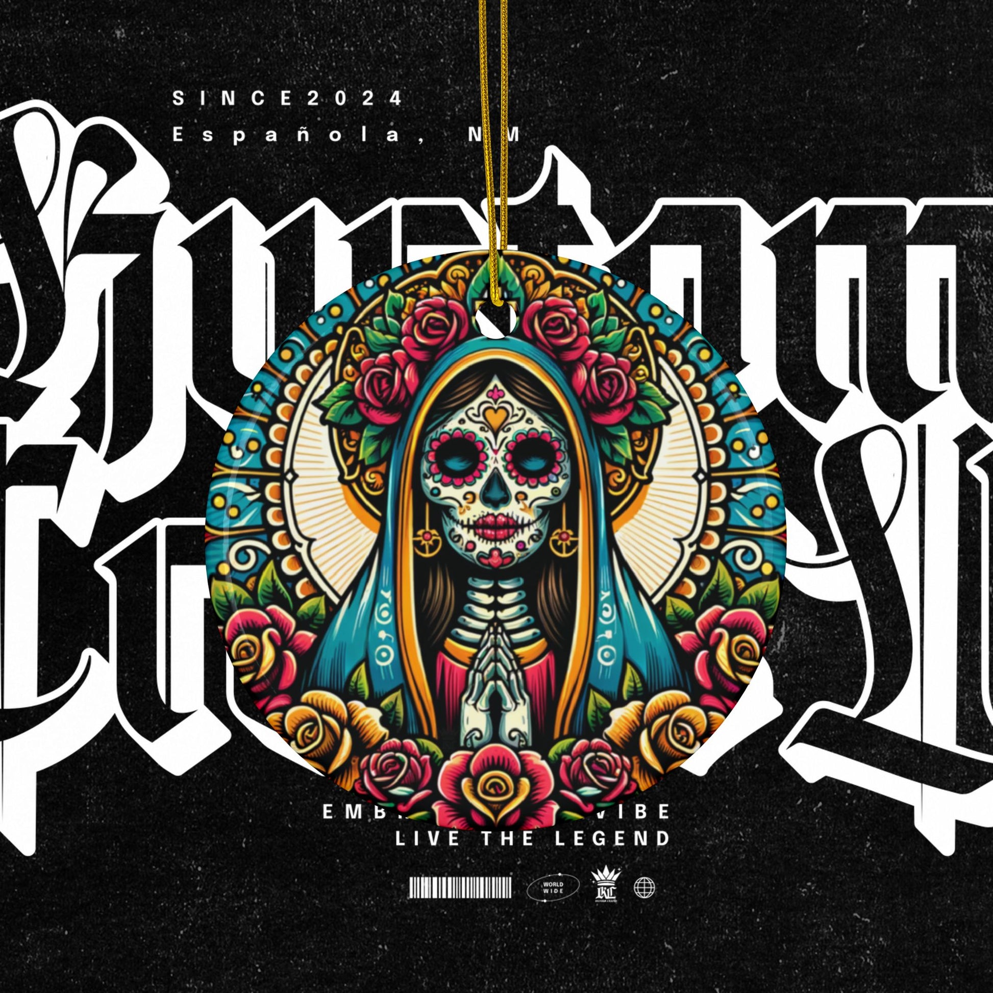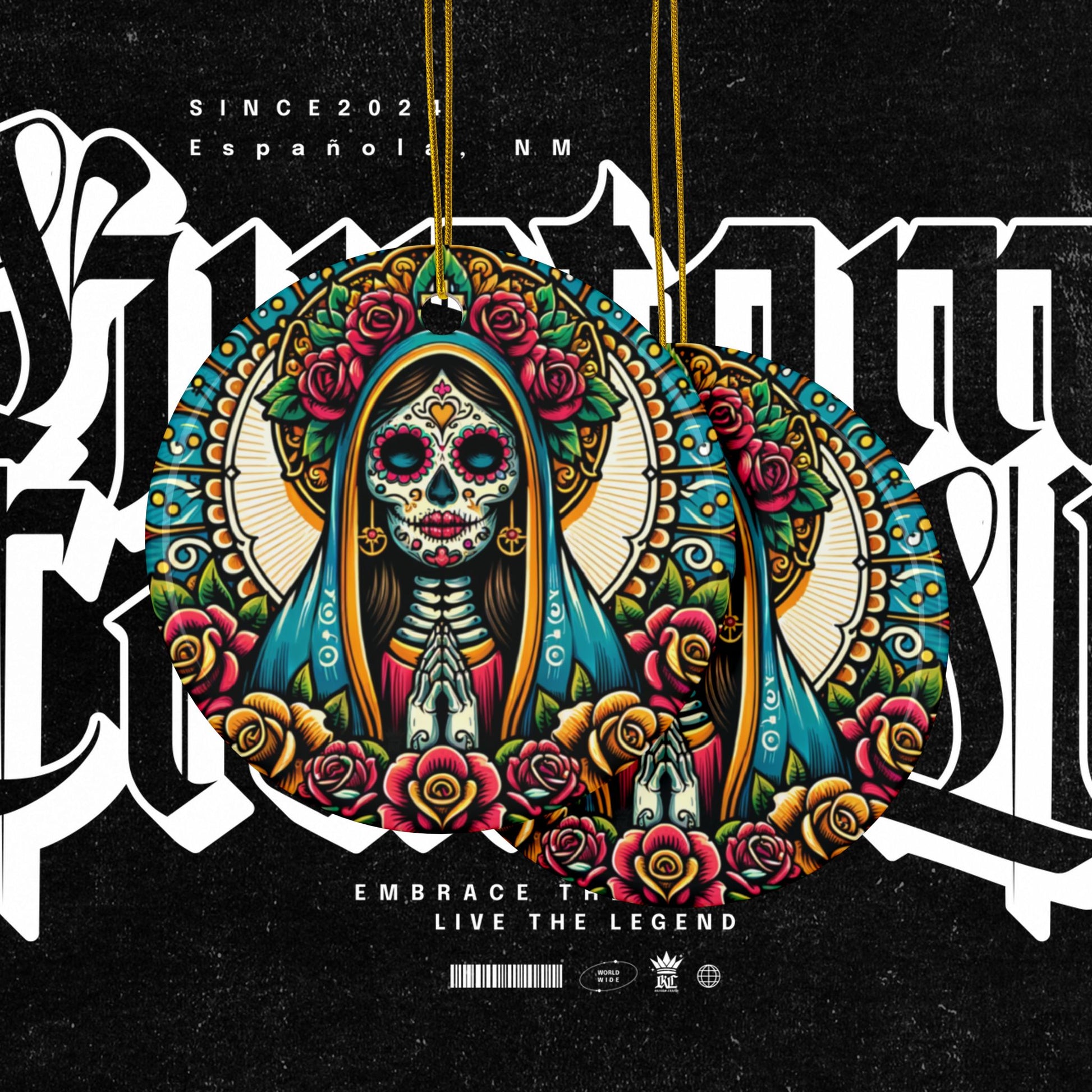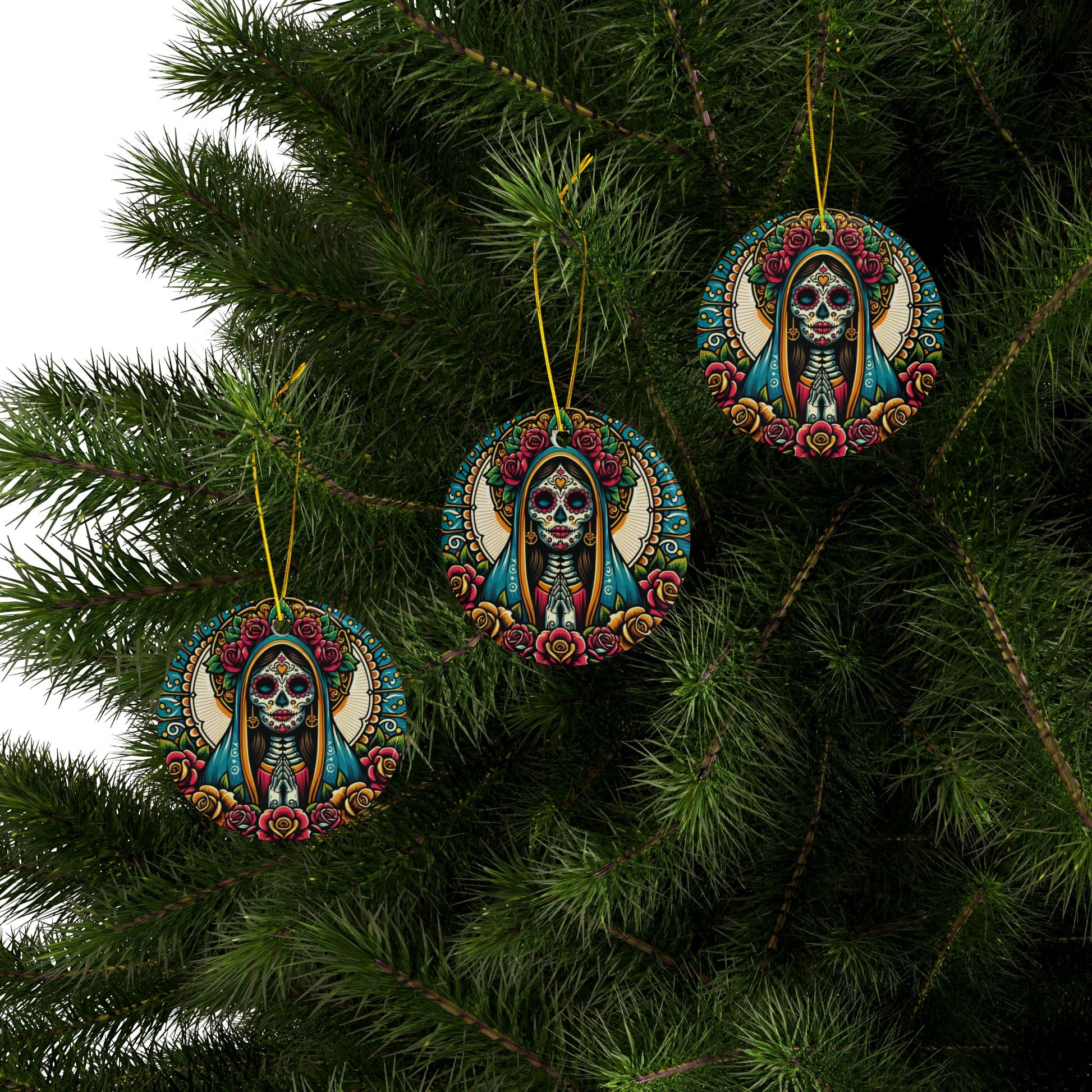 Vibrant dia de los muertos themed ceramic ornaments featuring a two-side print of the virgin mary. Perfect for adding a colorful touch to your holiday decor, these ornaments are ideal for those who appreciate unique and eye-catching decorations.