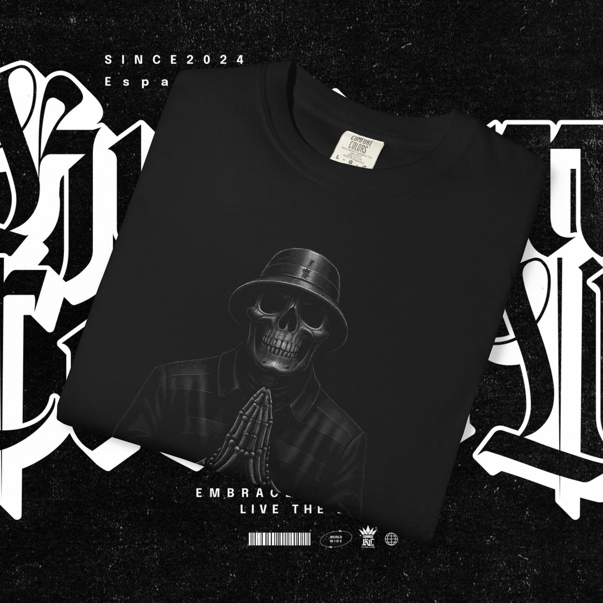 This chicano prayer T-shirt exudes a stylish and cultural vibe, perfect for those who appreciate Chicano art and culture. Ideal for casual wear or as a statement piece for cultural events and celebrations.
