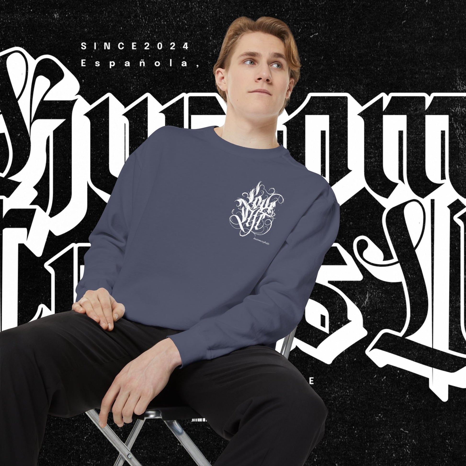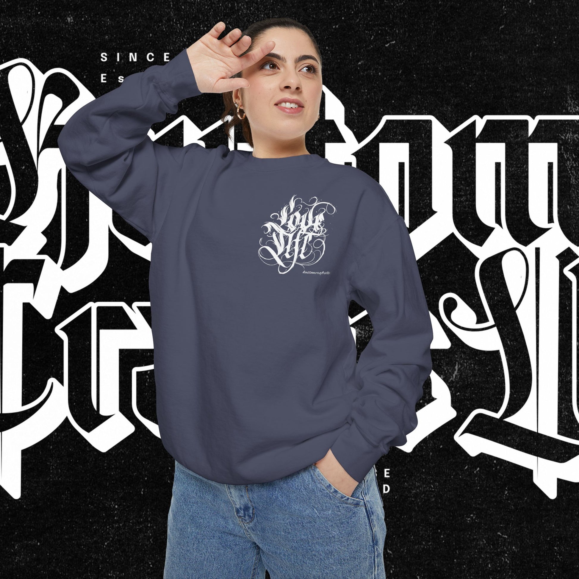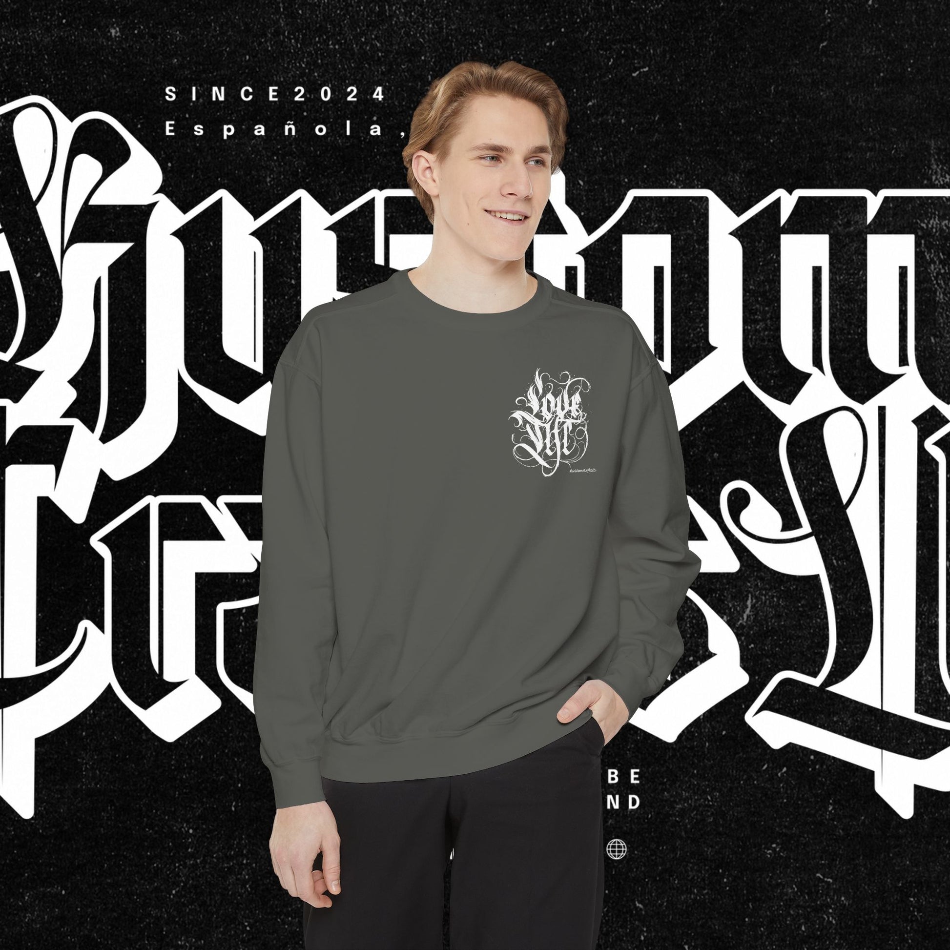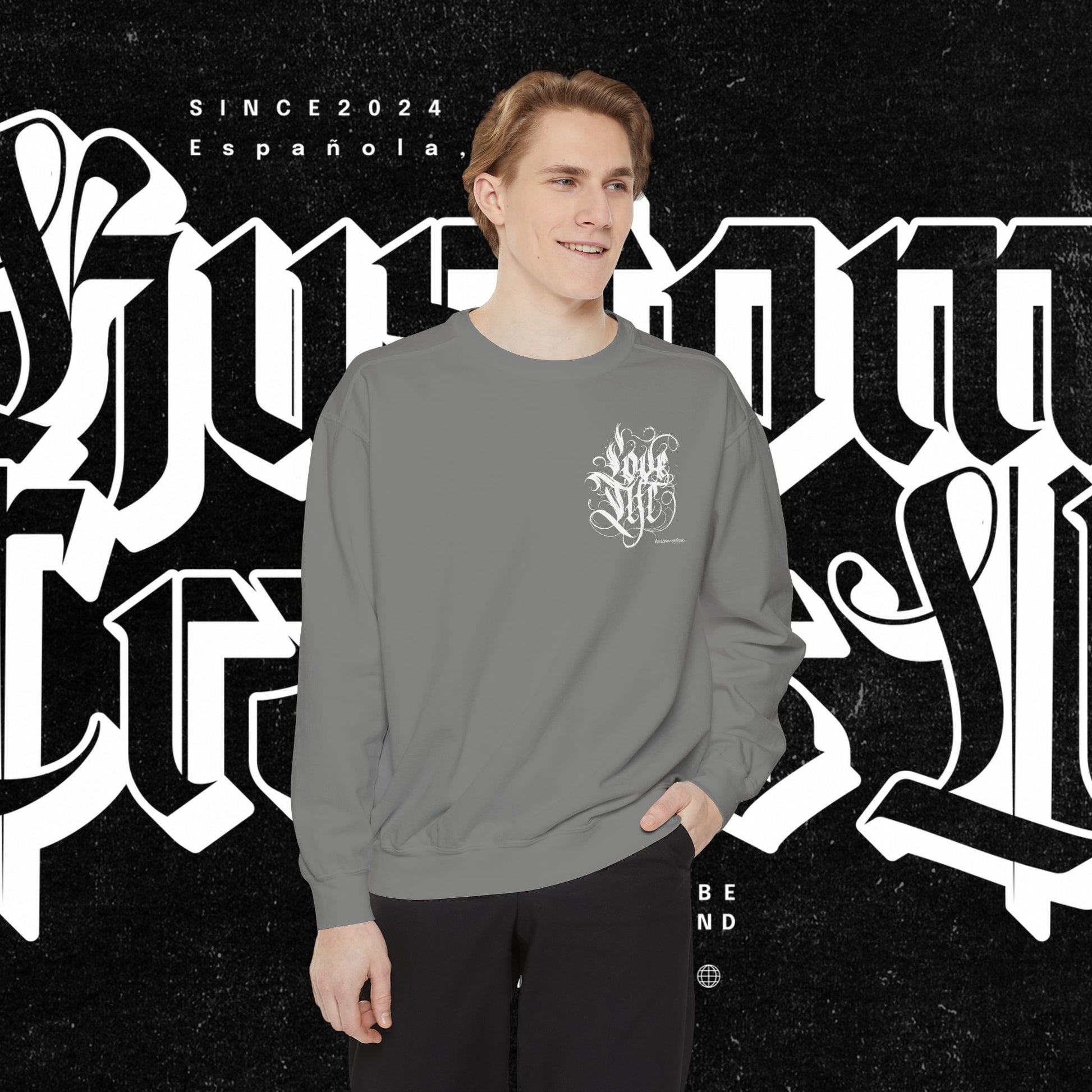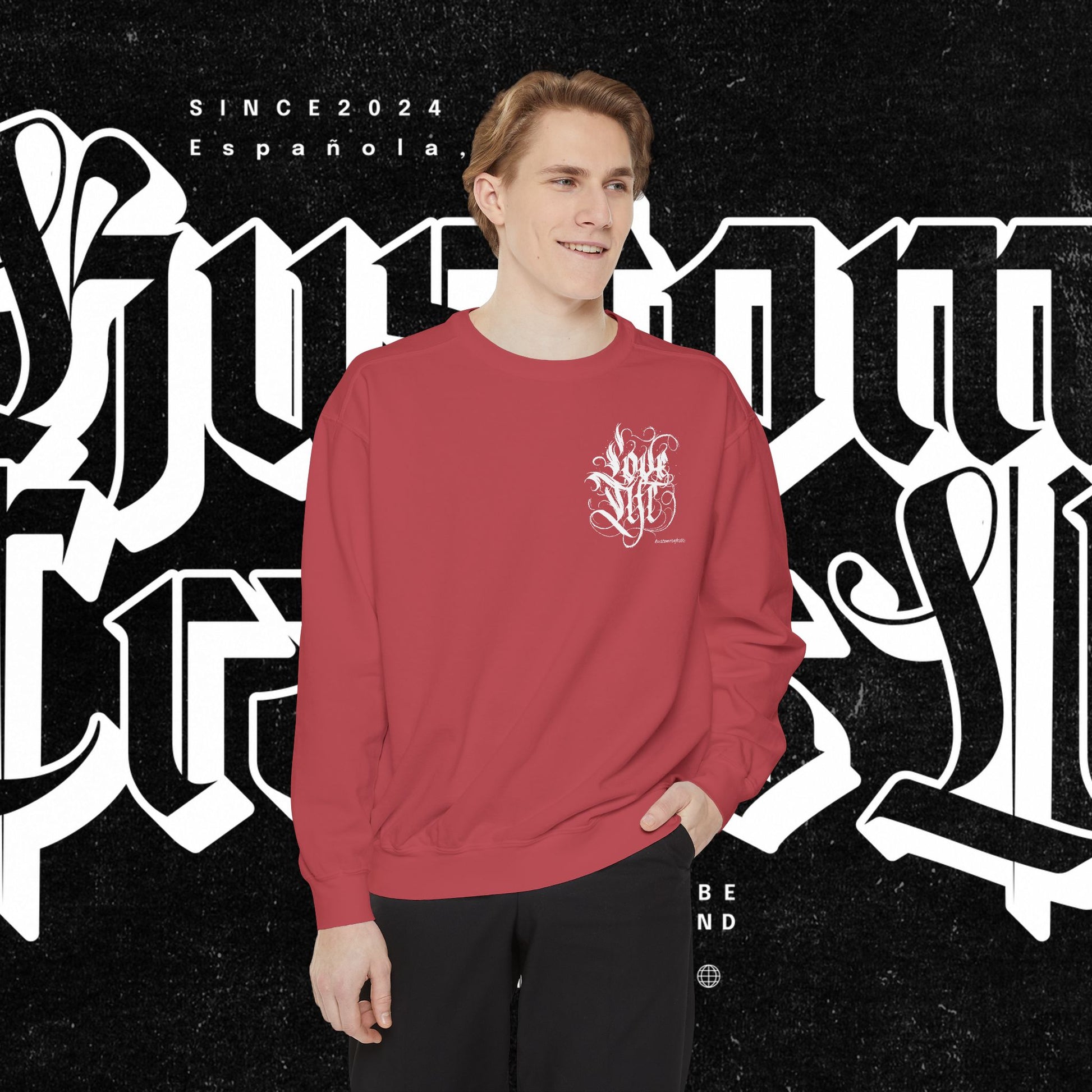 Love Life Graffiti Garment-Dyed Sweatshirt for Cozy Days, Unisex Comfortable Crewneck, Perfect Gift for Birthdays, Holidays, Casual Wear