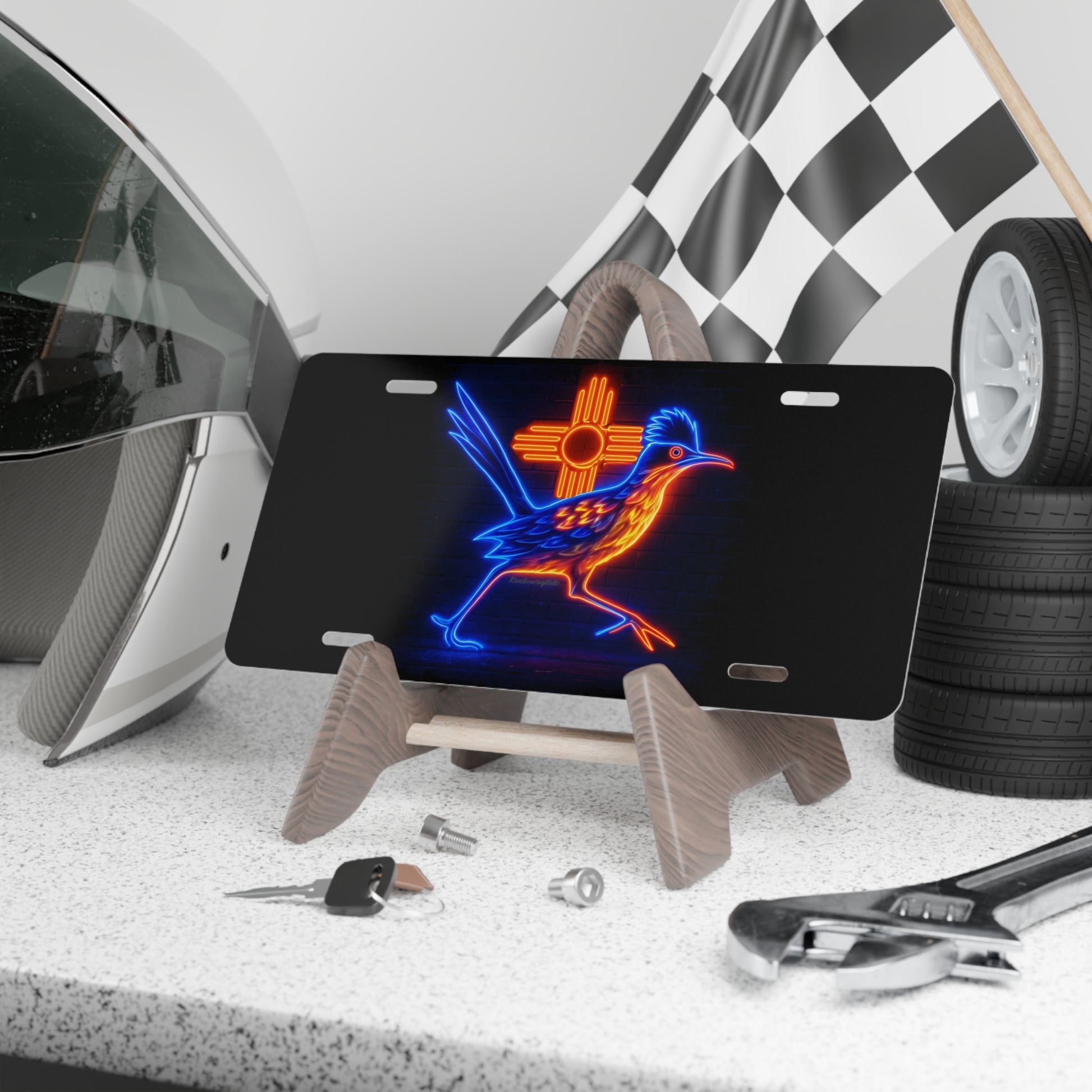 Add a touch of retro flair to your car with this neon roadrunner New Mexico license plate. Perfect for car enthusiasts, road trip lovers, and those who appreciate unique and colorful designs. Ideal for decorating your car during road trips, route 66 tours, car shows, and summer festivals.