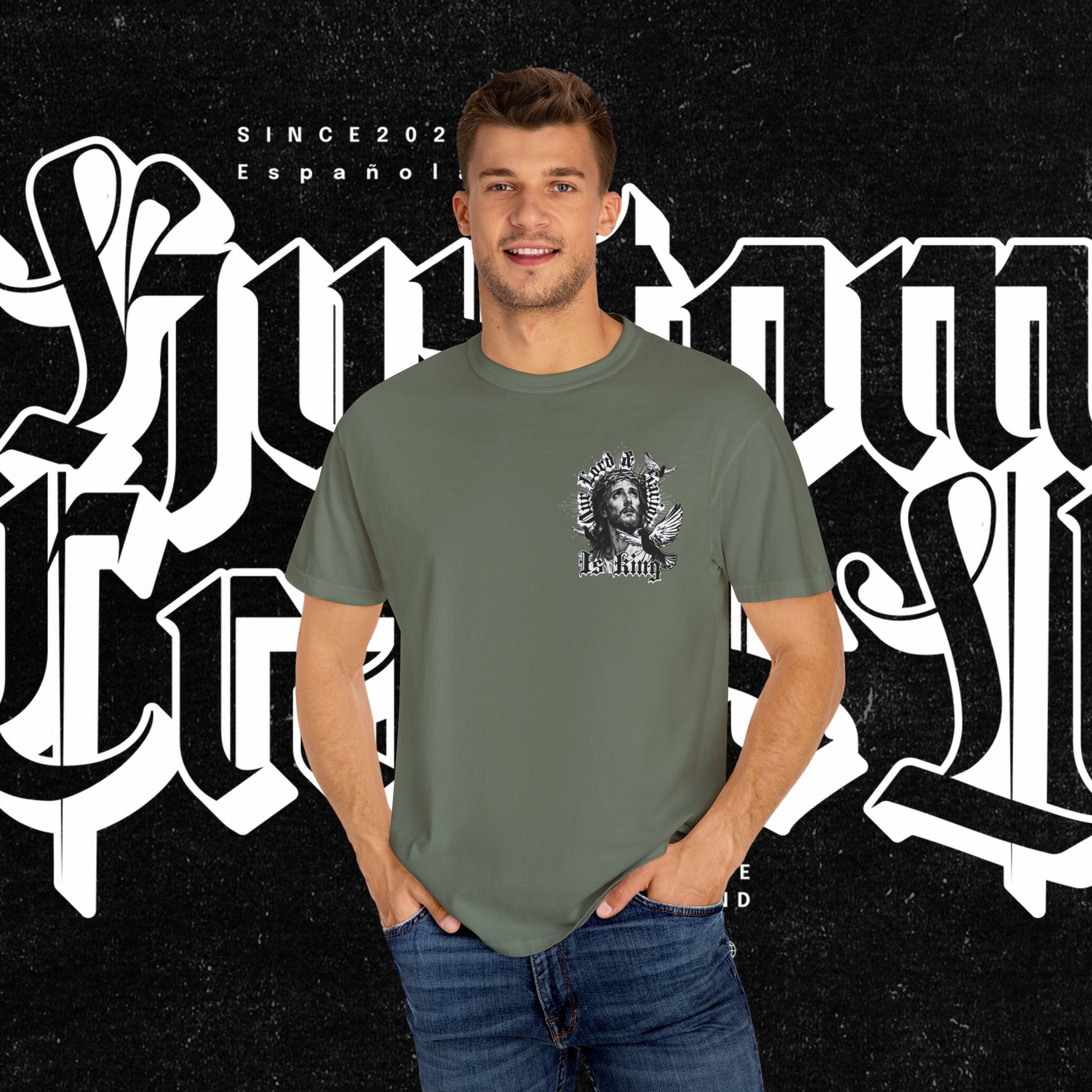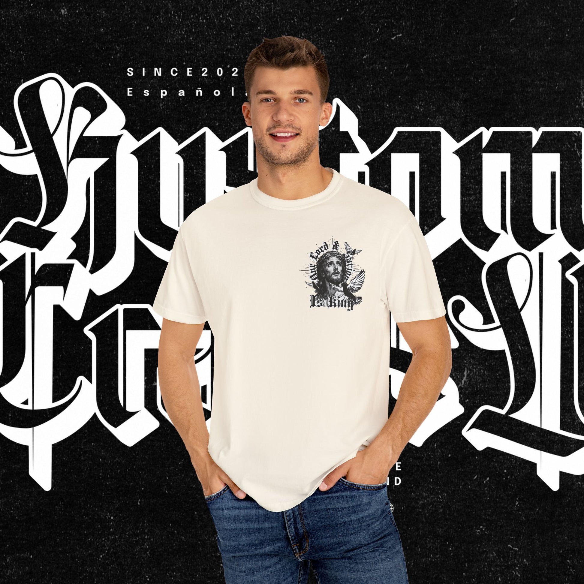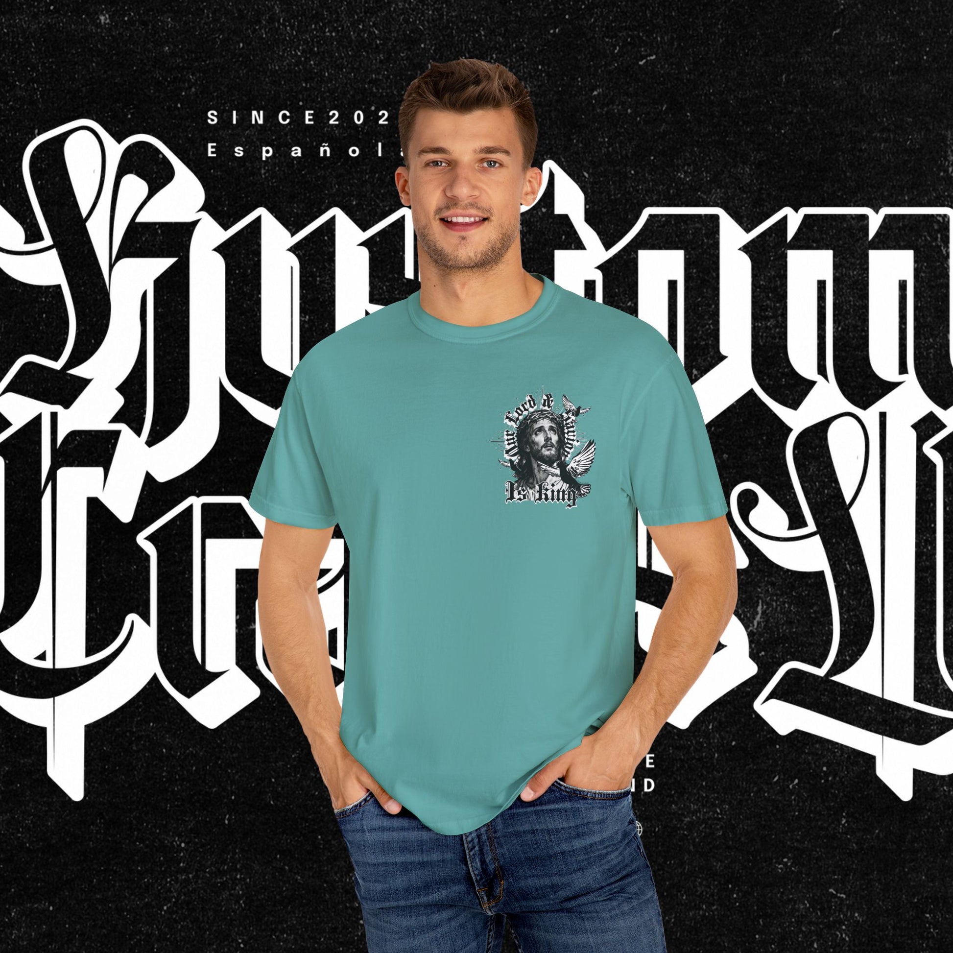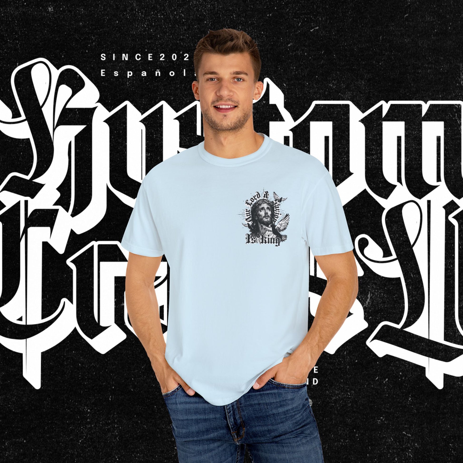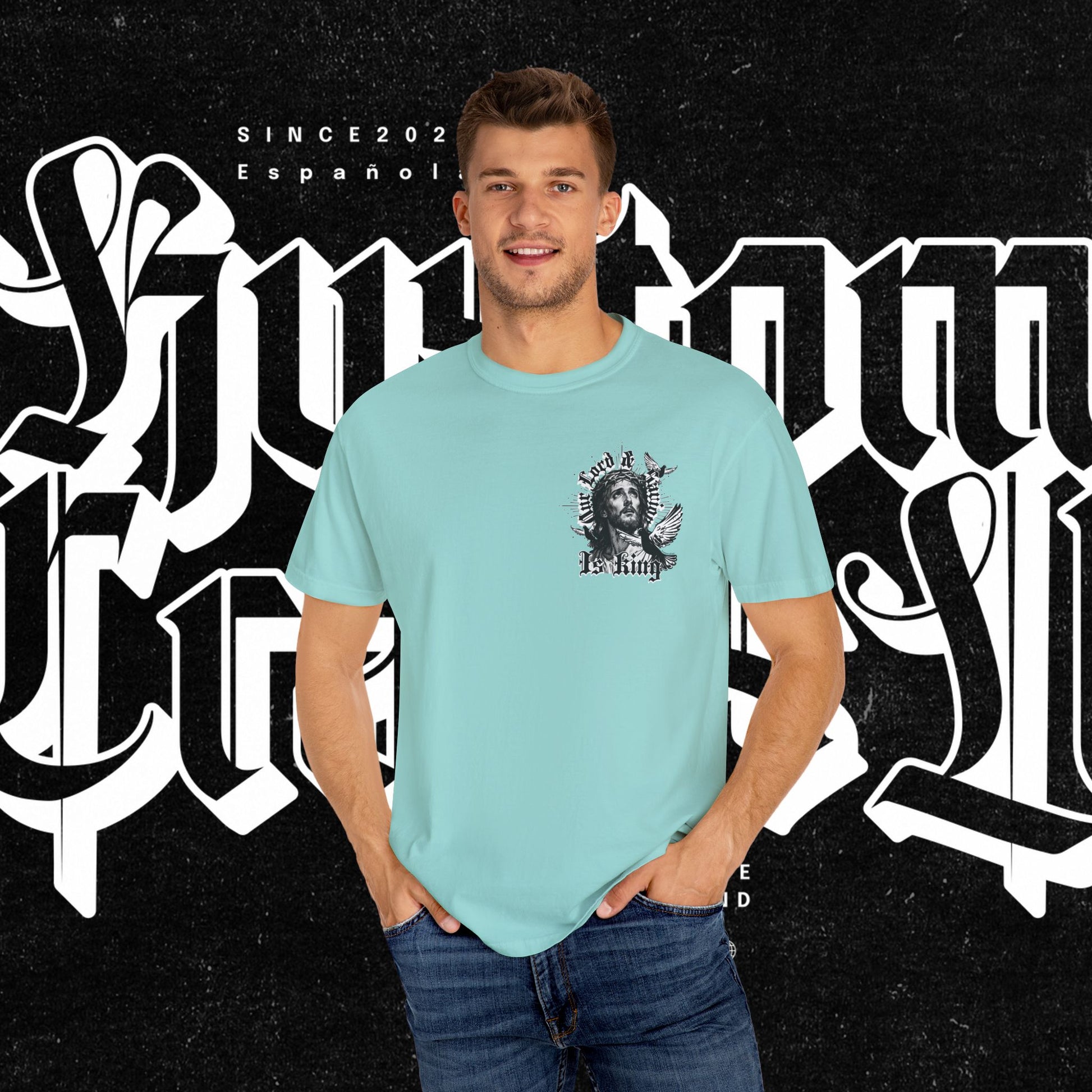 This unisex garment-dyed T-shirt features the phrase 'Our lord and savior is king' printed on the front, giving off a bold and spiritual vibe. Perfect for those looking to make a statement with their wardrobe. Ideal for religious holidays and events.