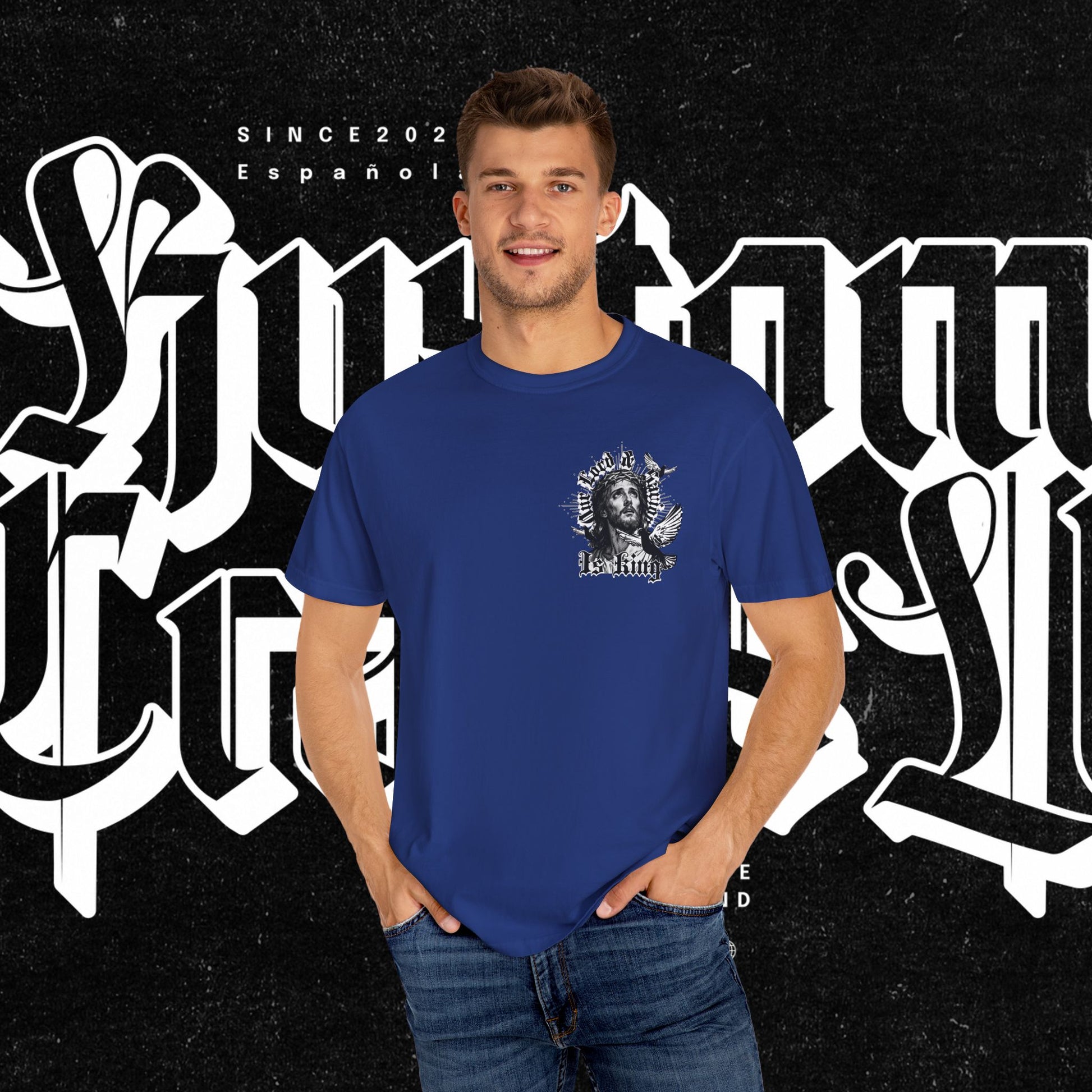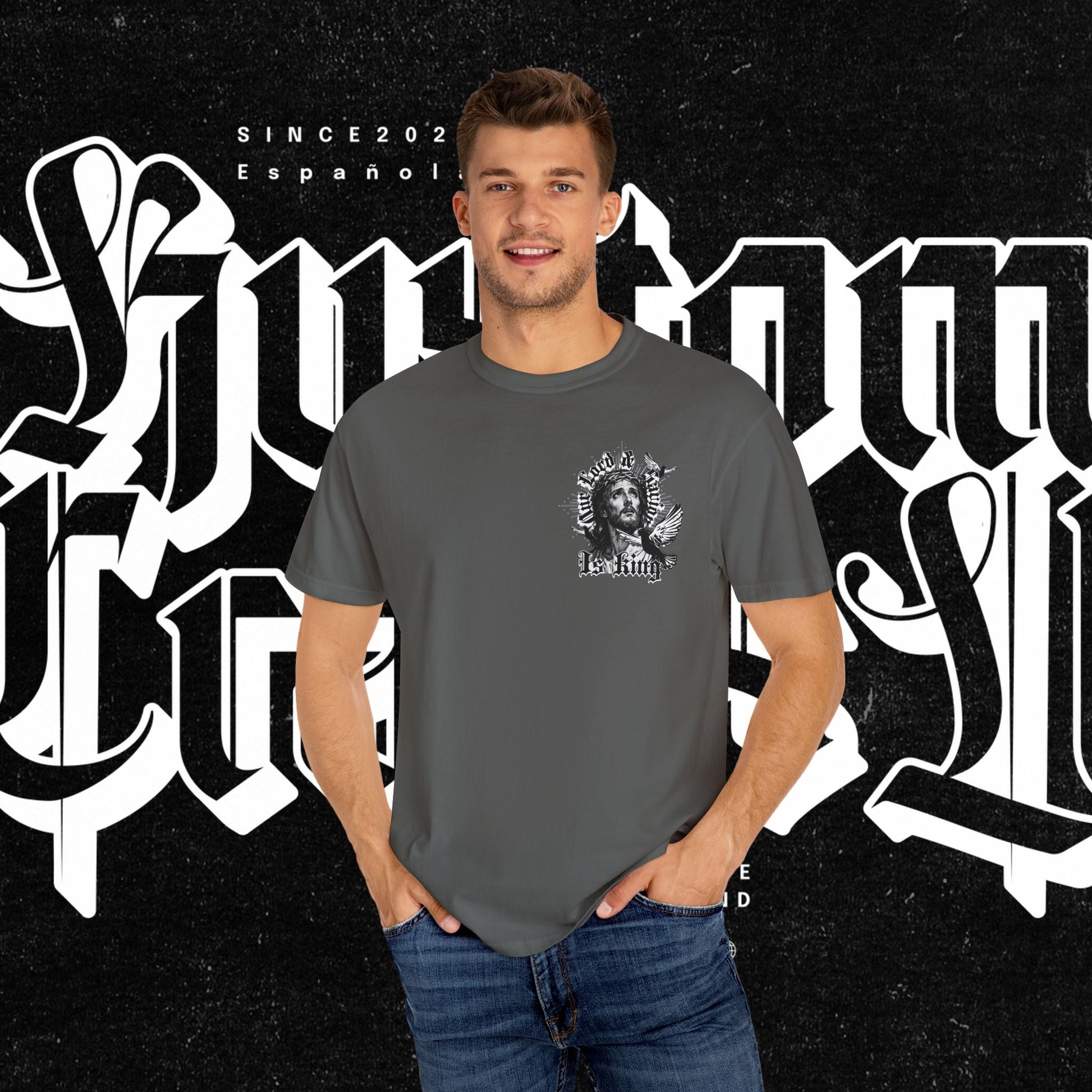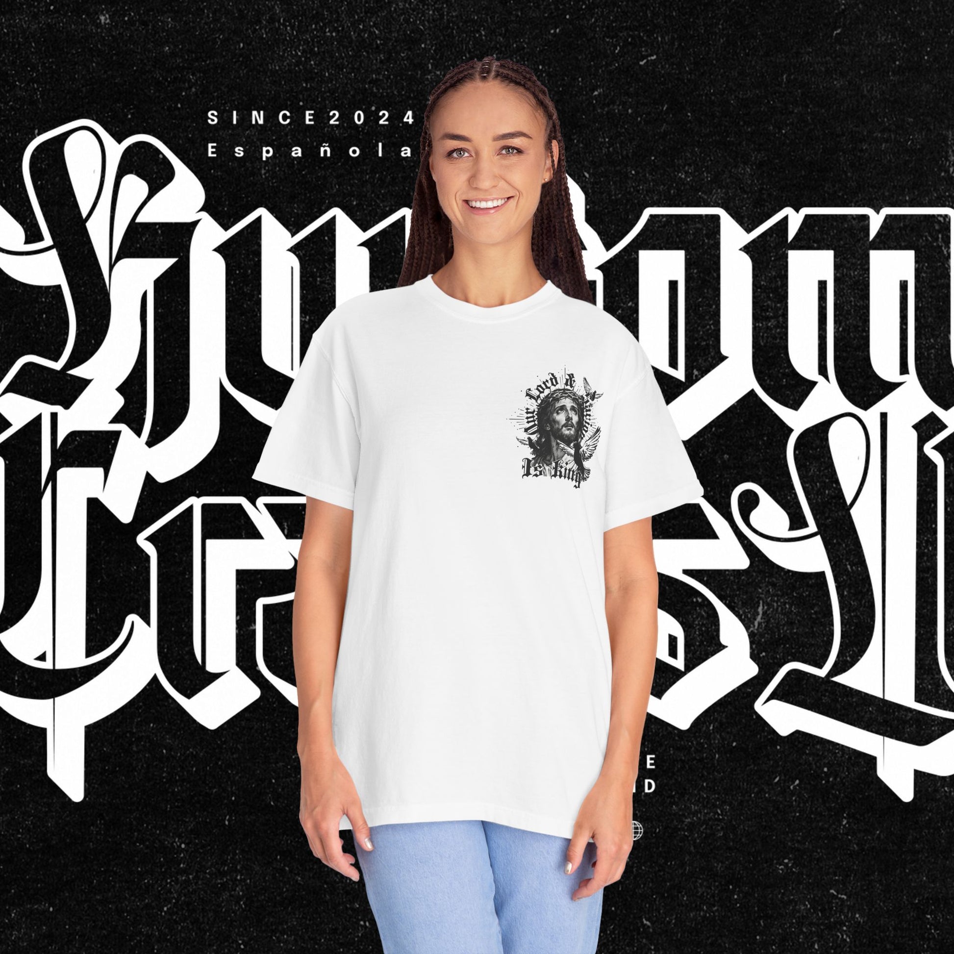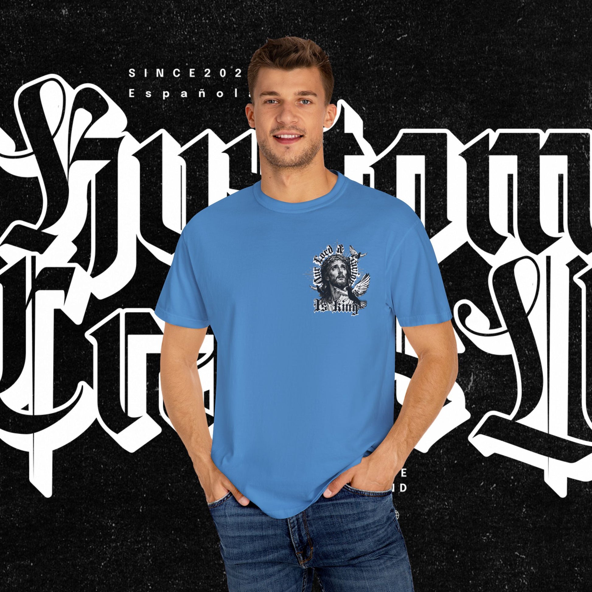 This unisex garment-dyed T-shirt features the phrase 'Our lord and savior is king' printed on the front, giving off a bold and spiritual vibe. Perfect for those looking to make a statement with their wardrobe. Ideal for religious holidays and events.
