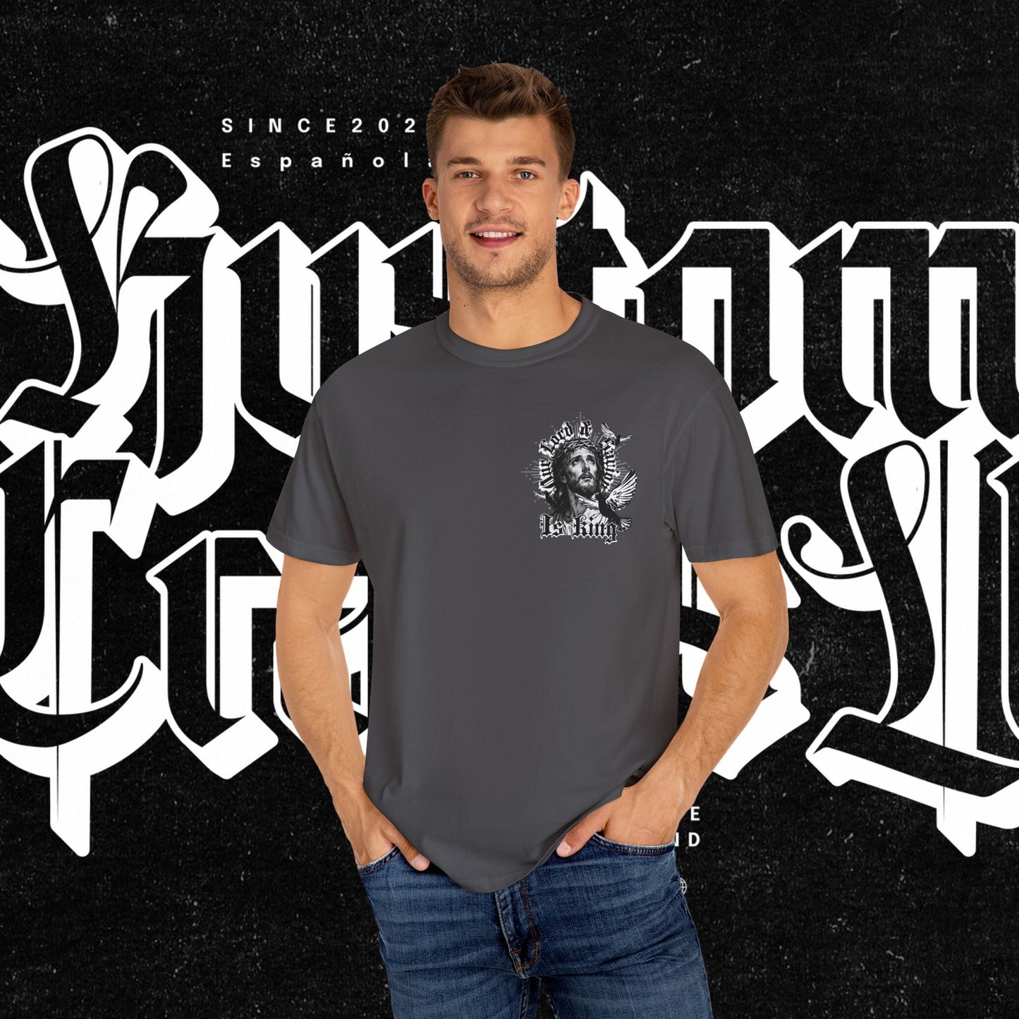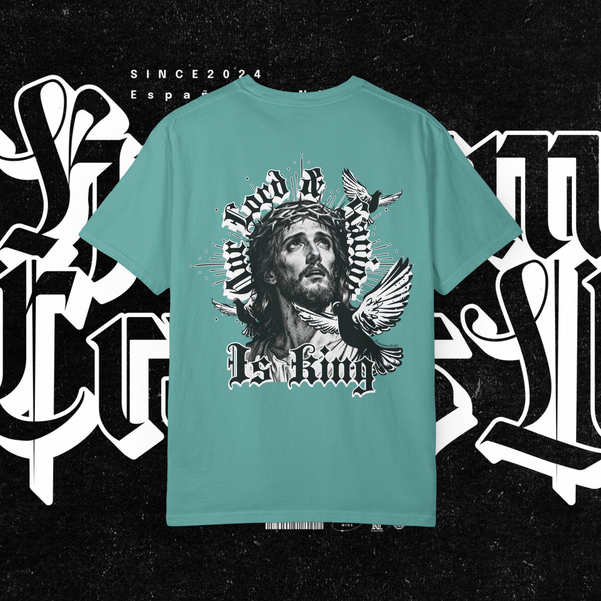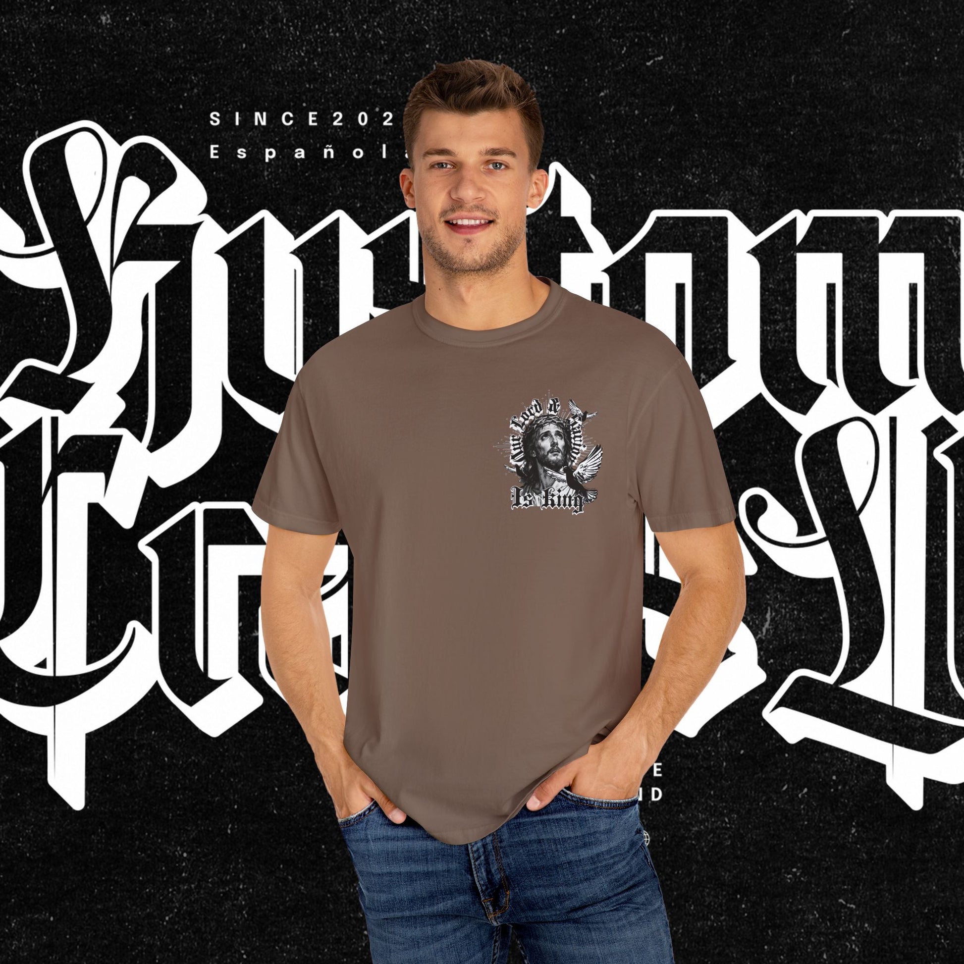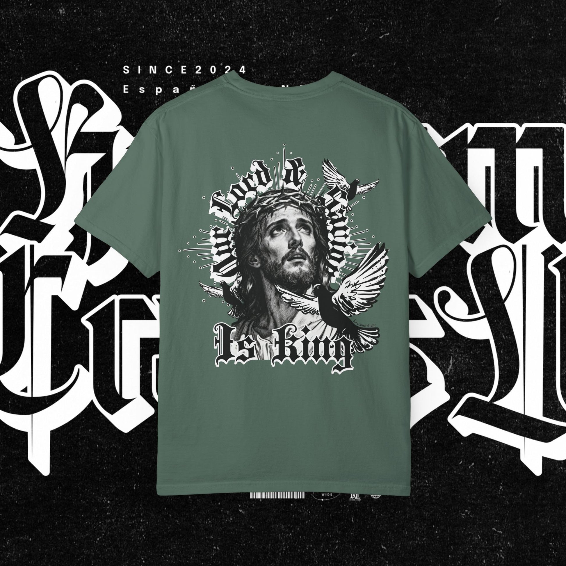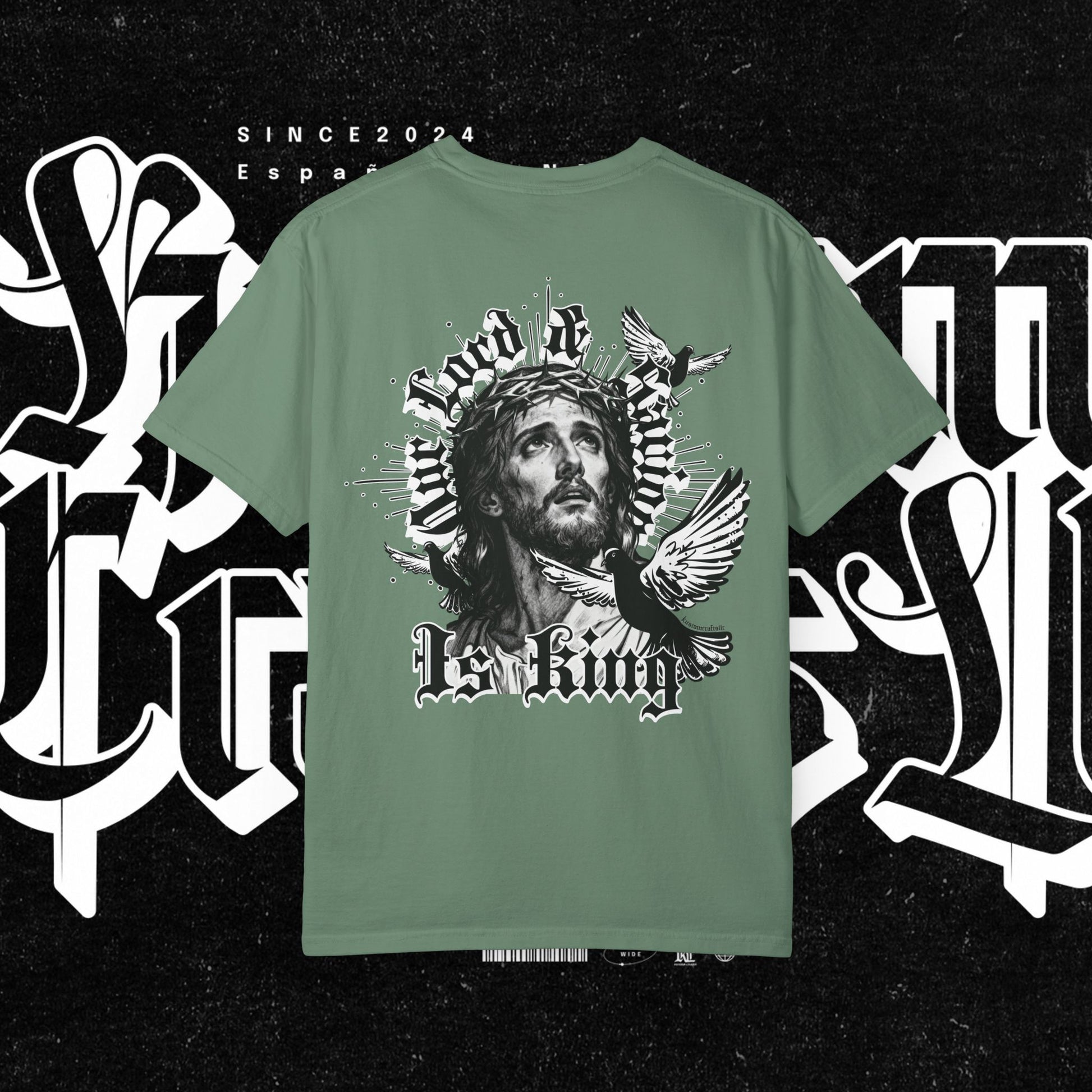 This unisex garment-dyed T-shirt features the phrase 'Our lord and savior is king' printed on the front, giving off a bold and spiritual vibe. Perfect for those looking to make a statement with their wardrobe. Ideal for religious holidays and events.