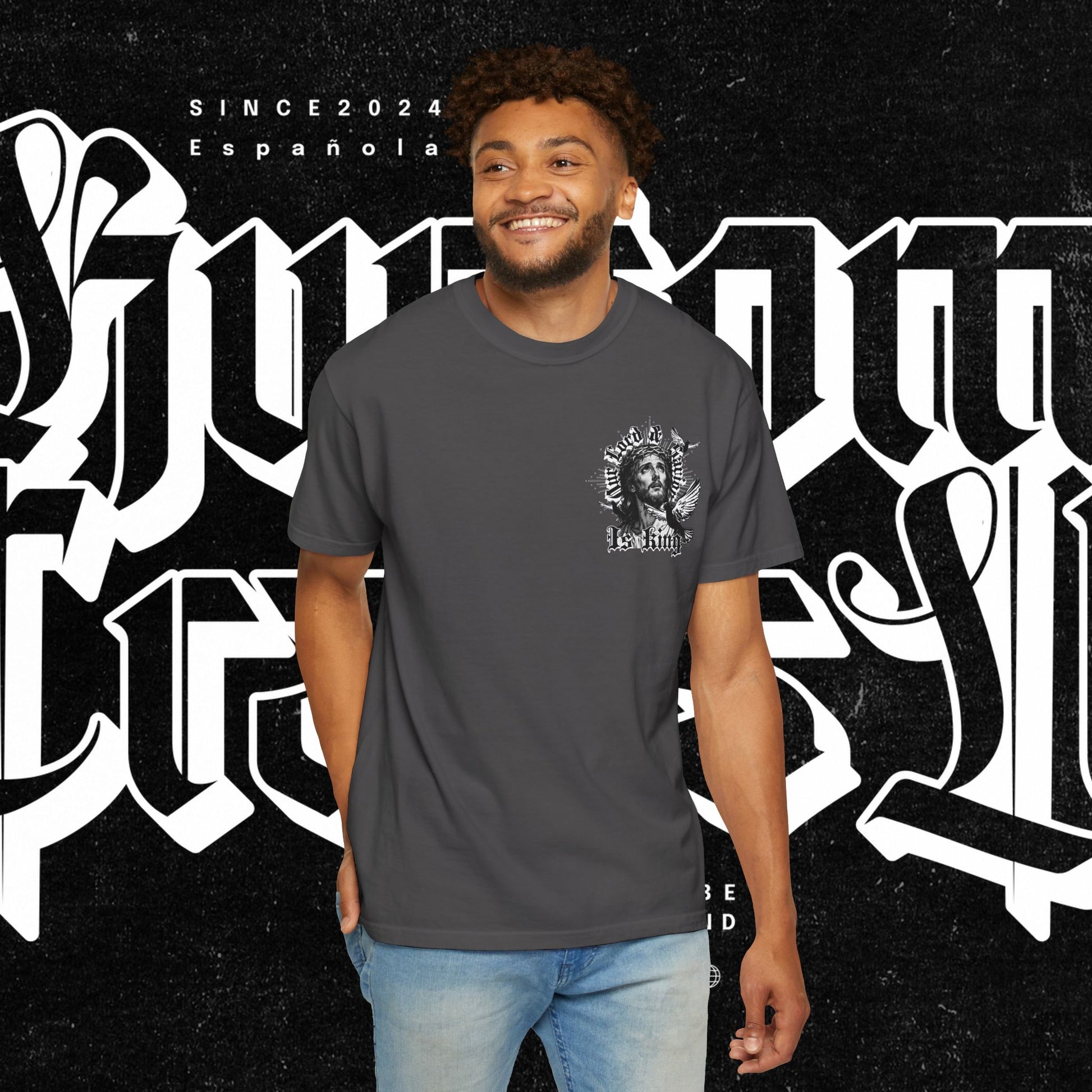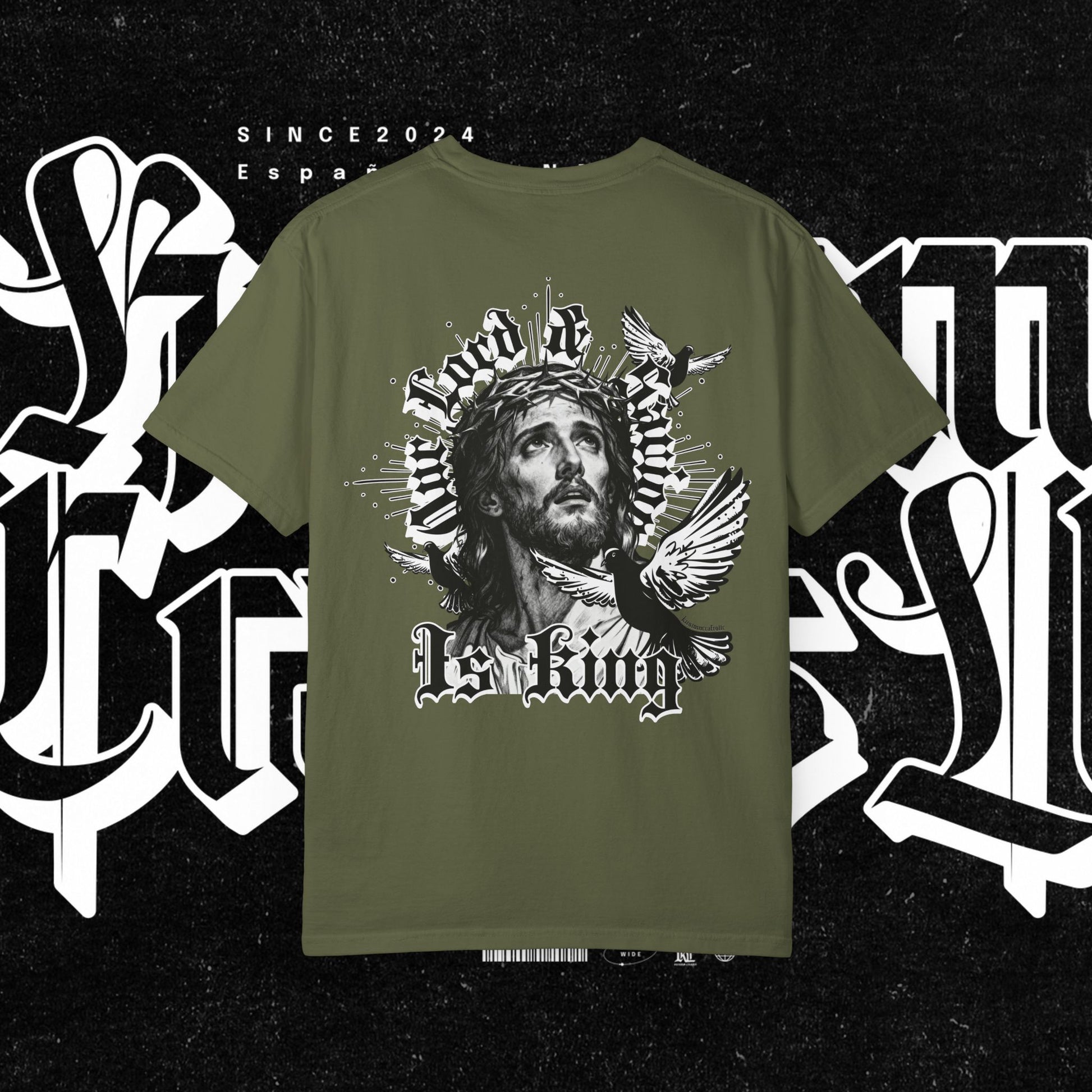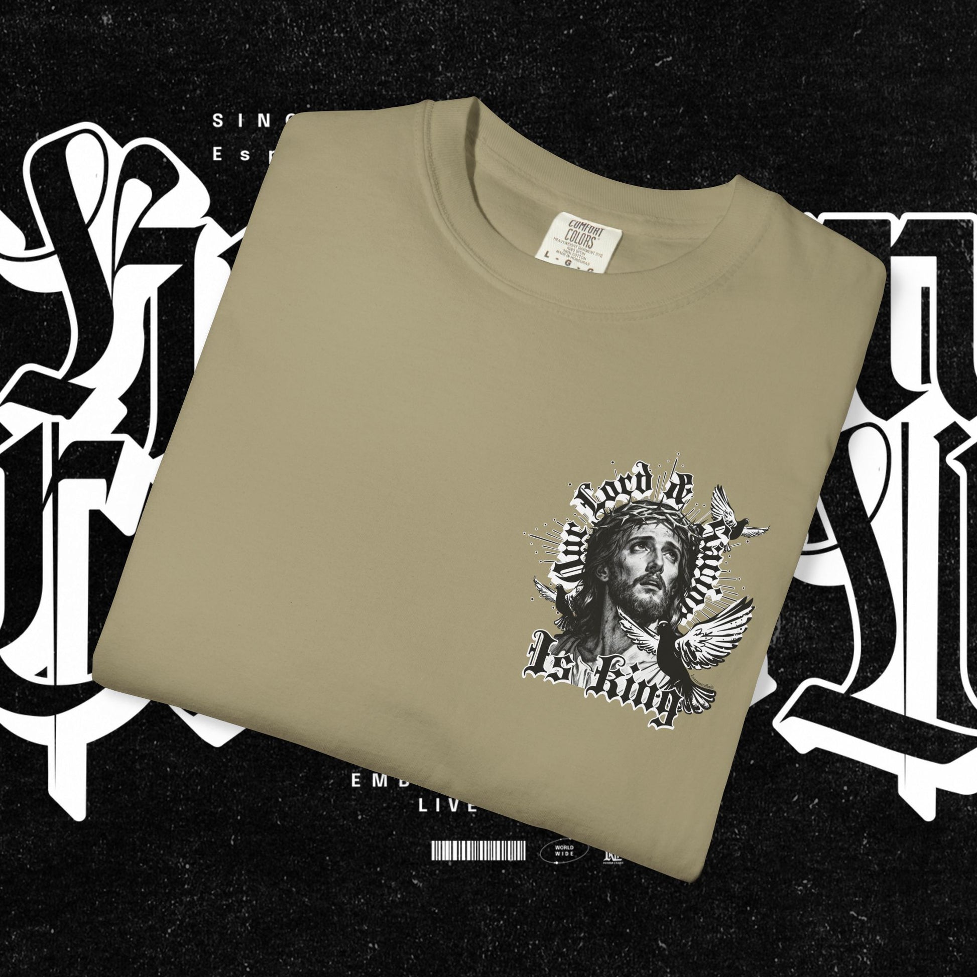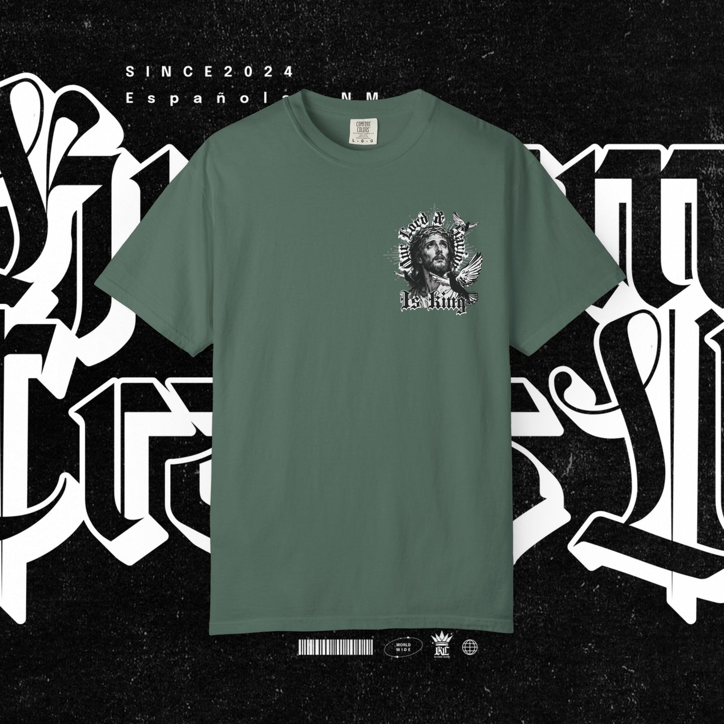 This unisex garment-dyed T-shirt features the phrase 'Our lord and savior is king' printed on the front, giving off a bold and spiritual vibe. Perfect for those looking to make a statement with their wardrobe. Ideal for religious holidays and events.