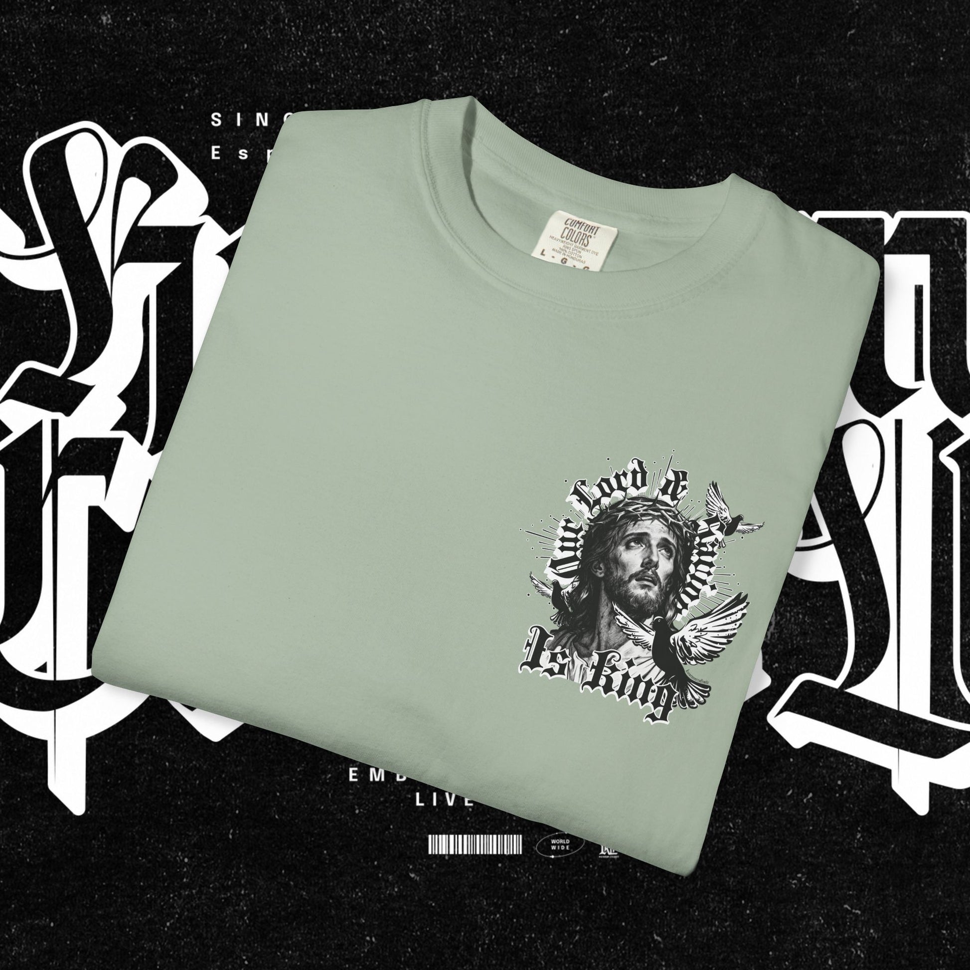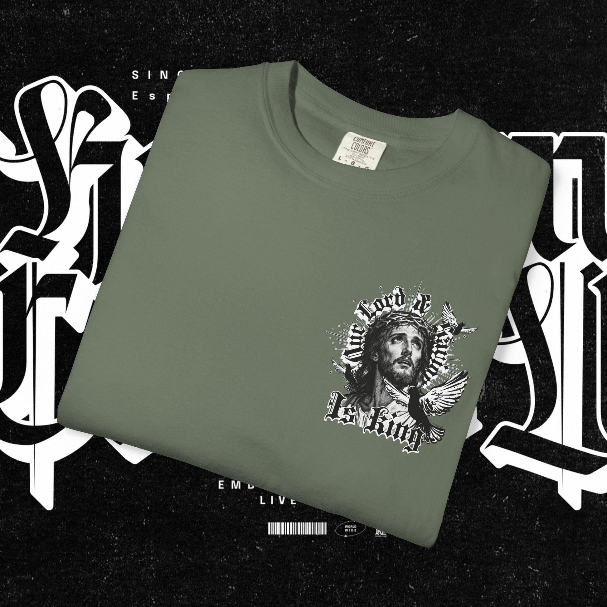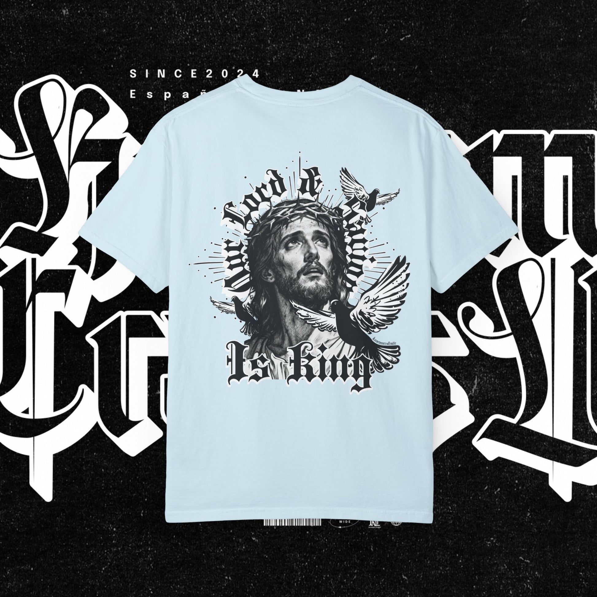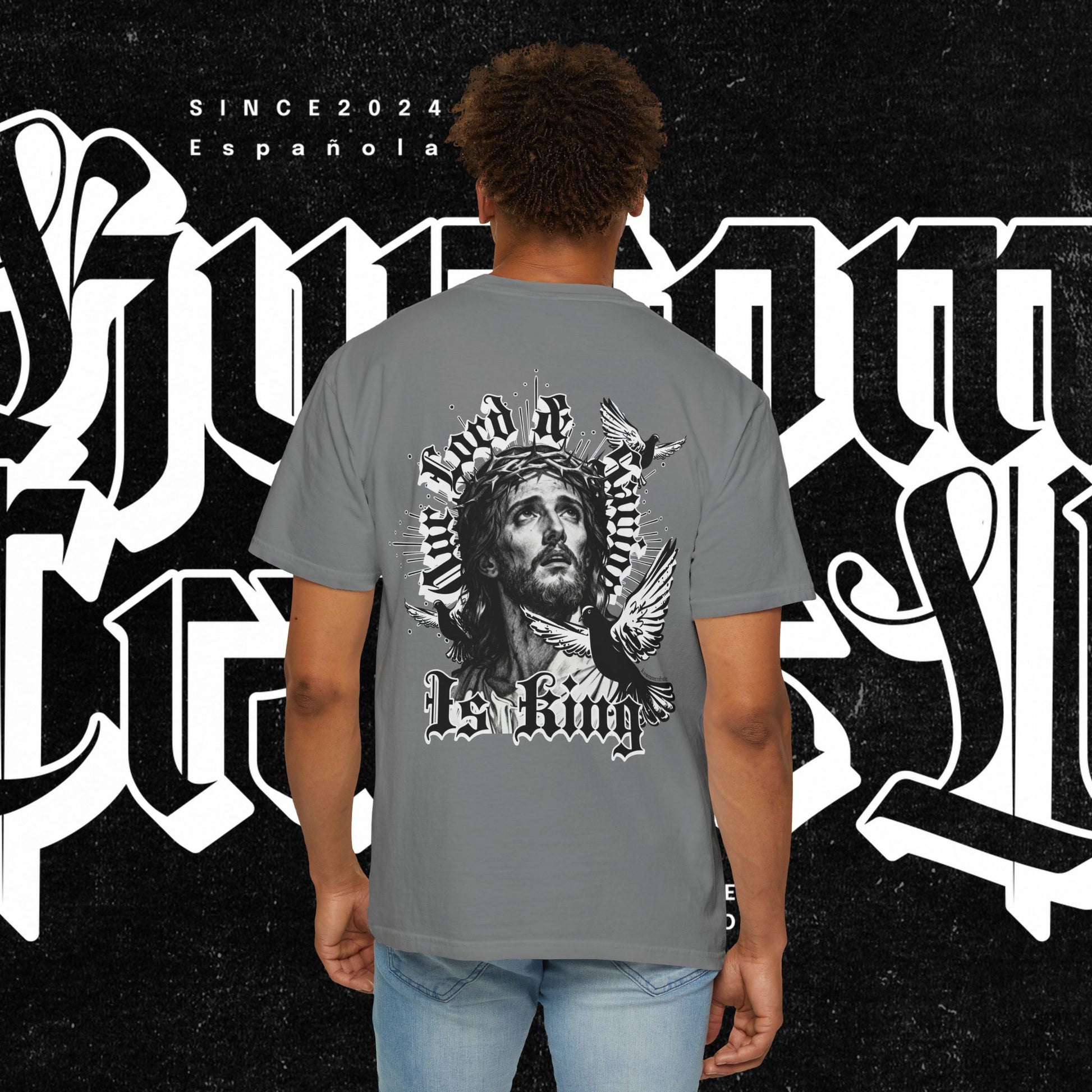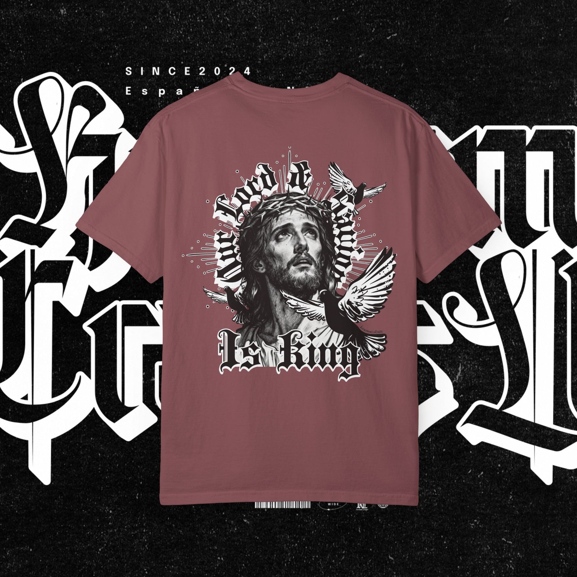 This unisex garment-dyed T-shirt features the phrase 'Our lord and savior is king' printed on the front, giving off a bold and spiritual vibe. Perfect for those looking to make a statement with their wardrobe. Ideal for religious holidays and events.