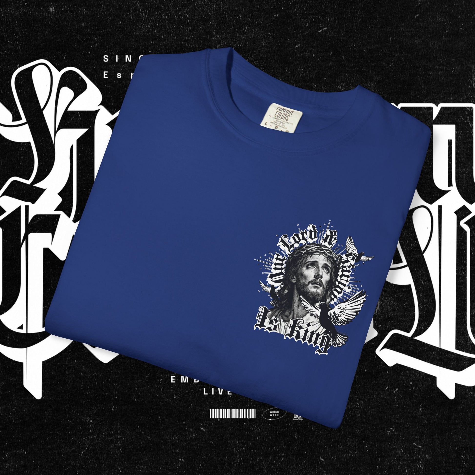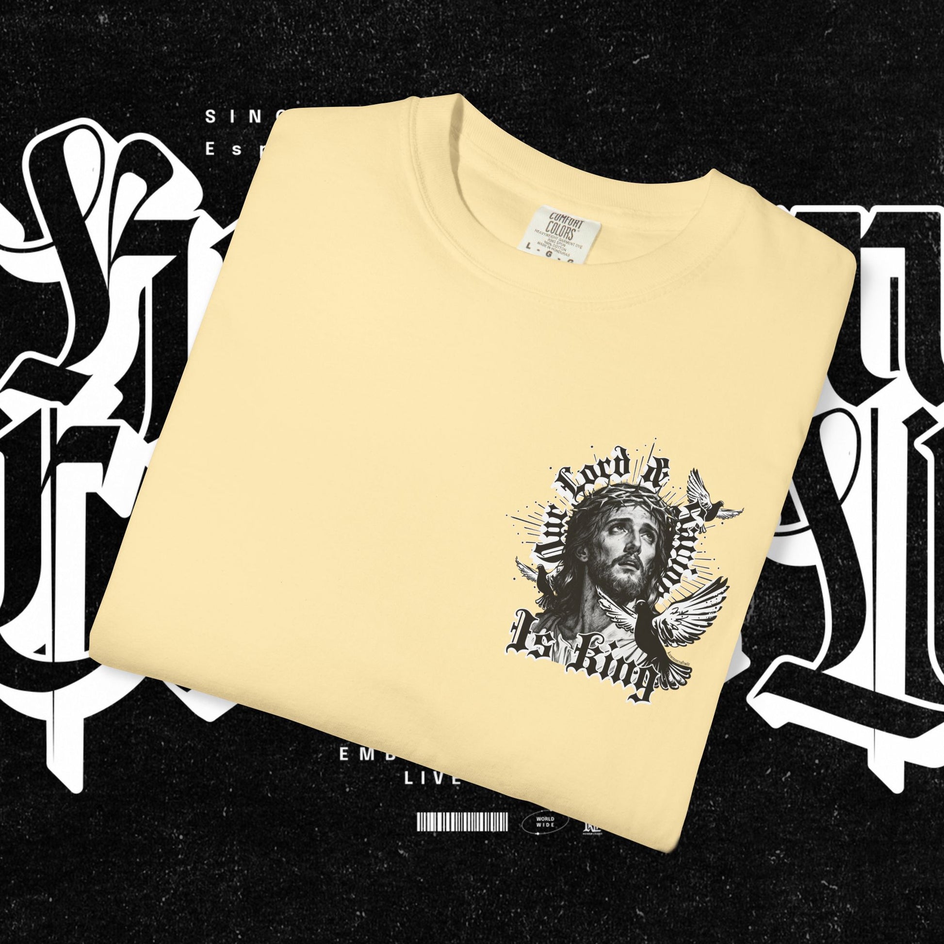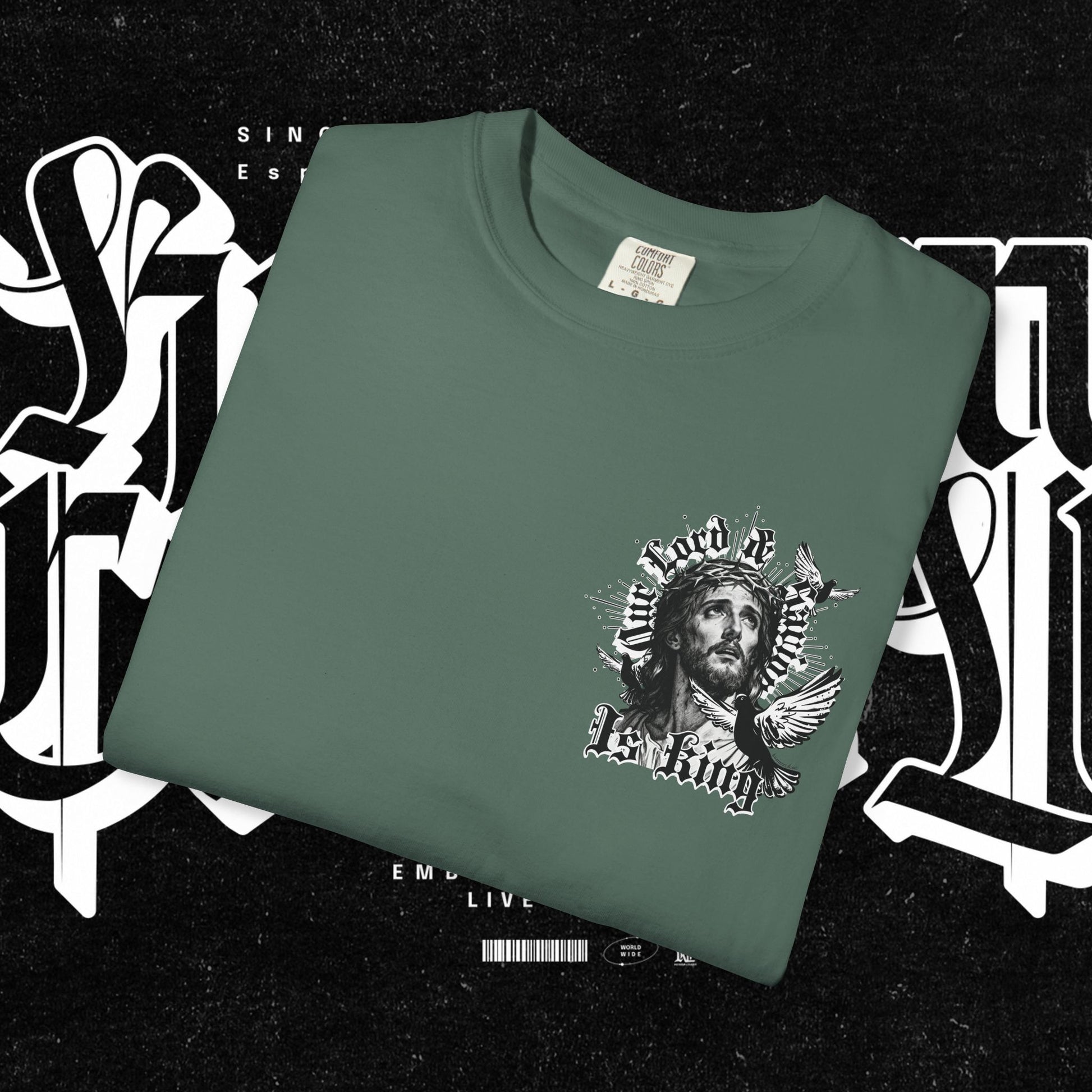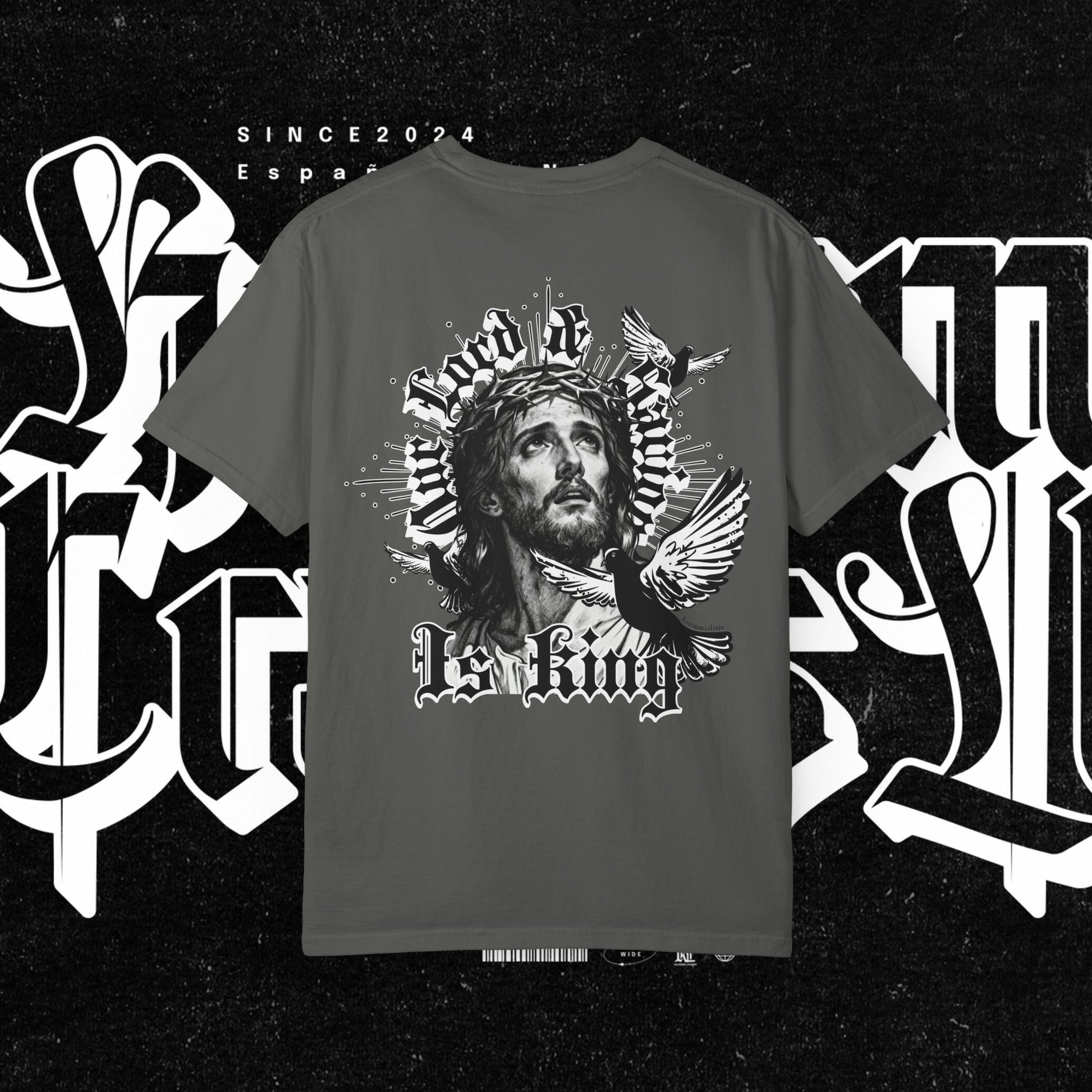 This unisex garment-dyed T-shirt features the phrase 'Our lord and savior is king' printed on the front, giving off a bold and spiritual vibe. Perfect for those looking to make a statement with their wardrobe. Ideal for religious holidays and events.
