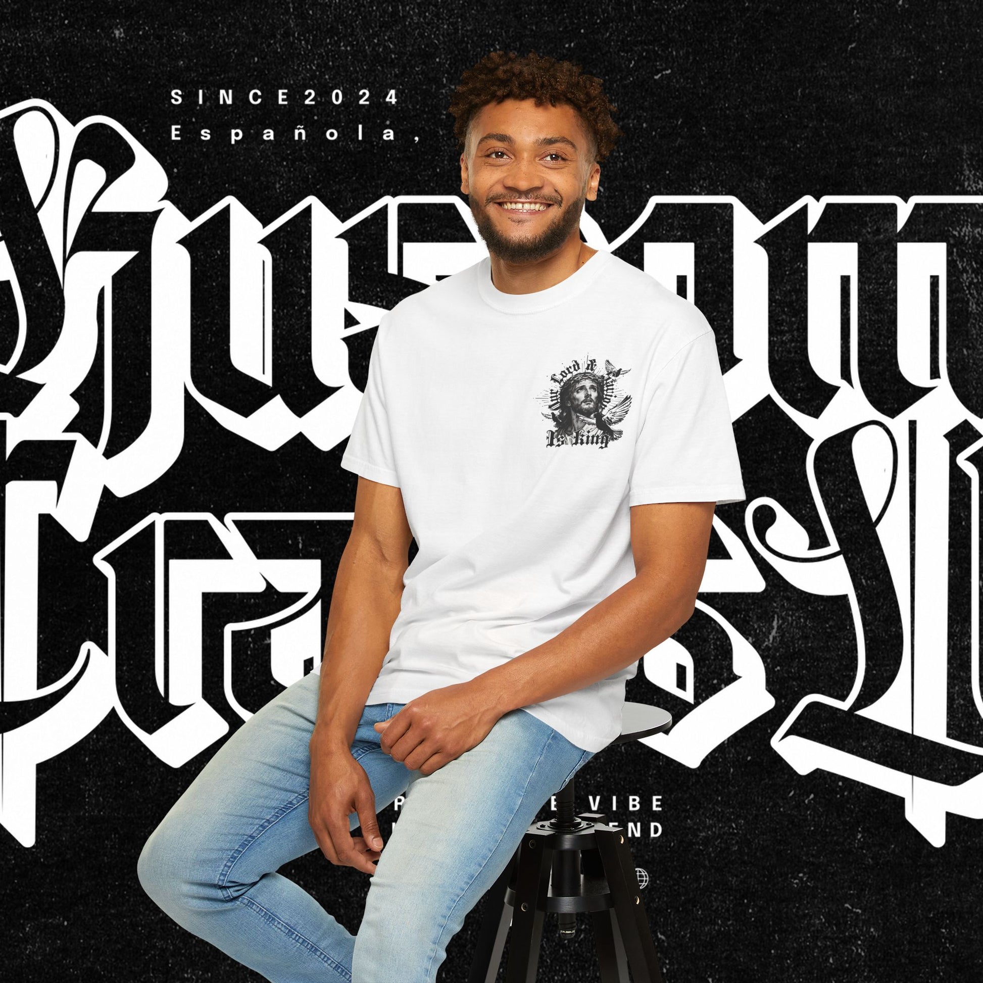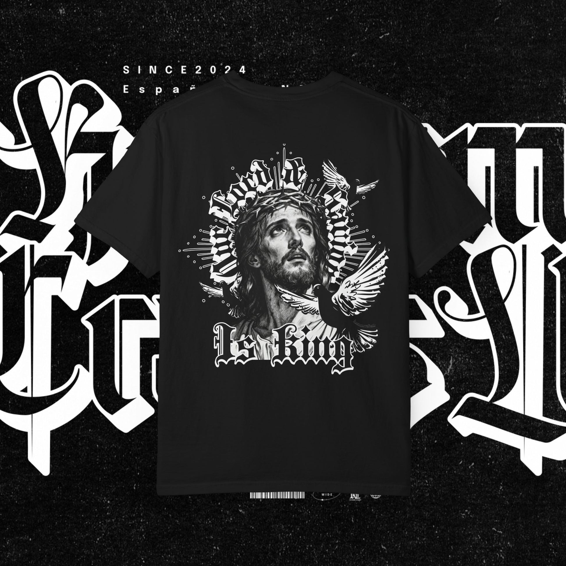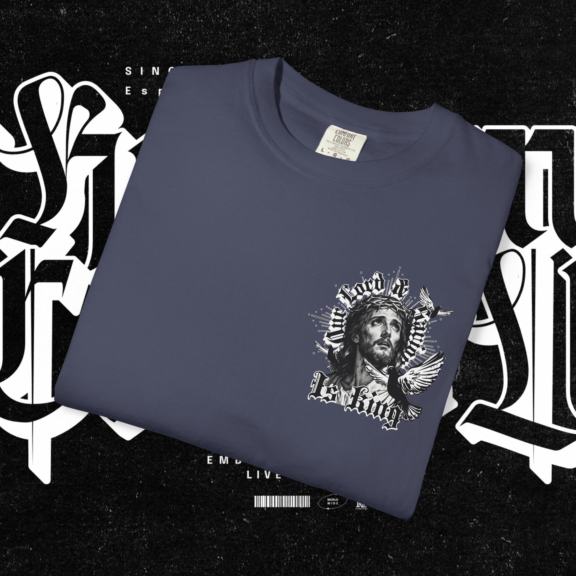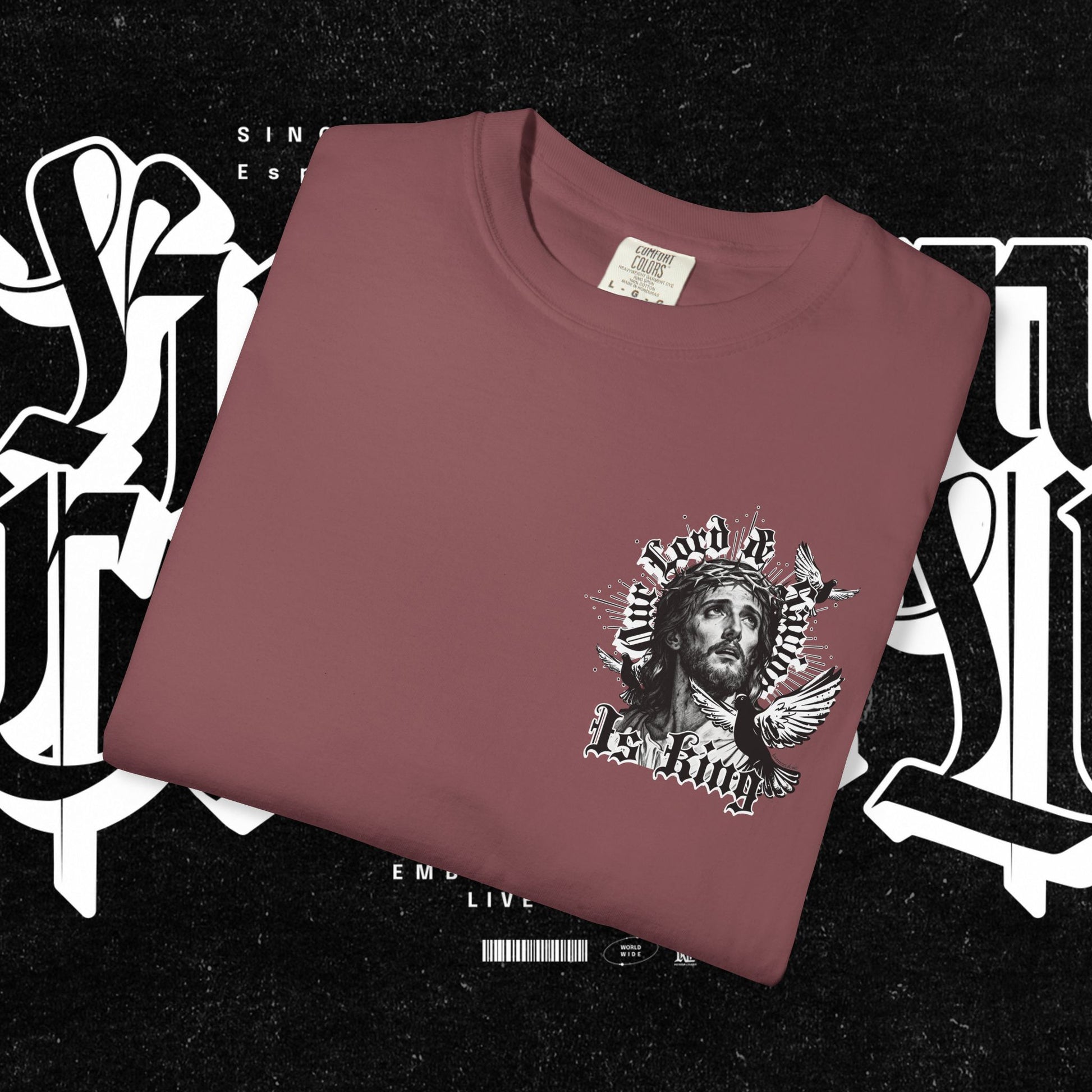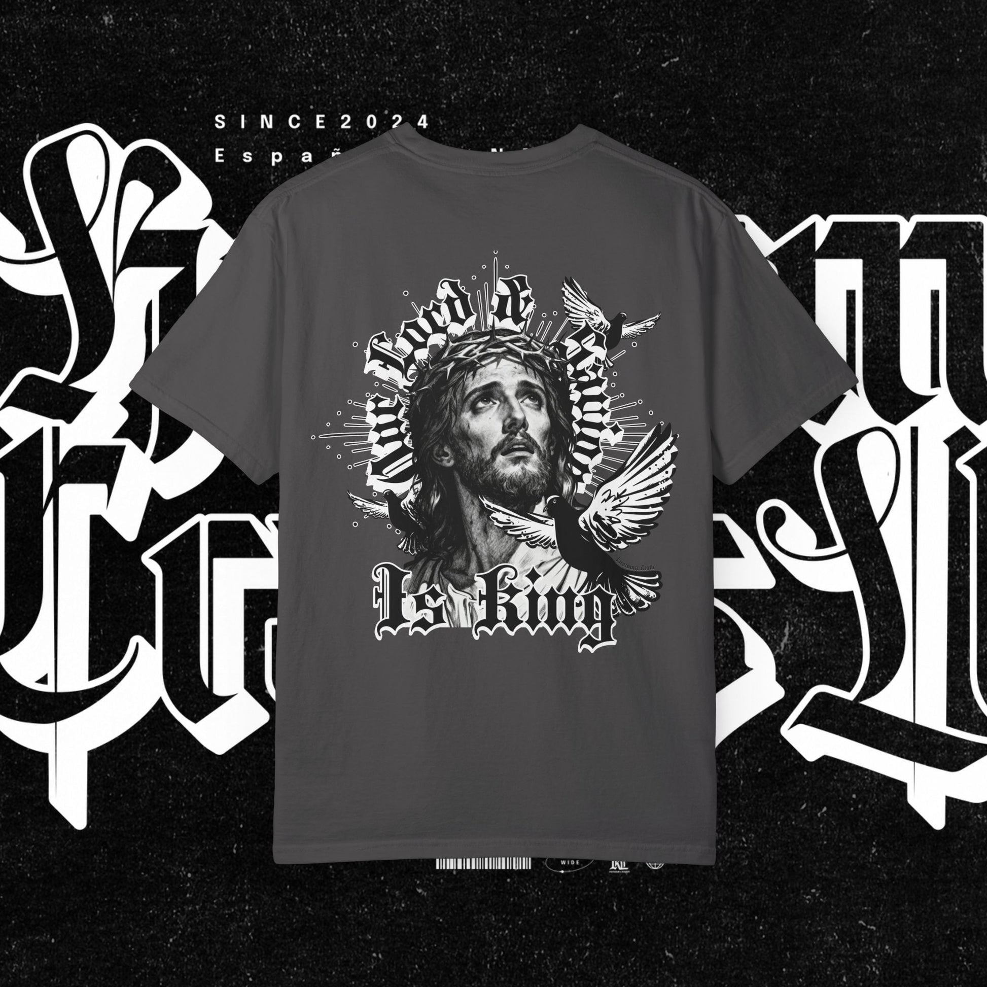 This unisex garment-dyed T-shirt features the phrase 'Our lord and savior is king' printed on the front, giving off a bold and spiritual vibe. Perfect for those looking to make a statement with their wardrobe. Ideal for religious holidays and events.